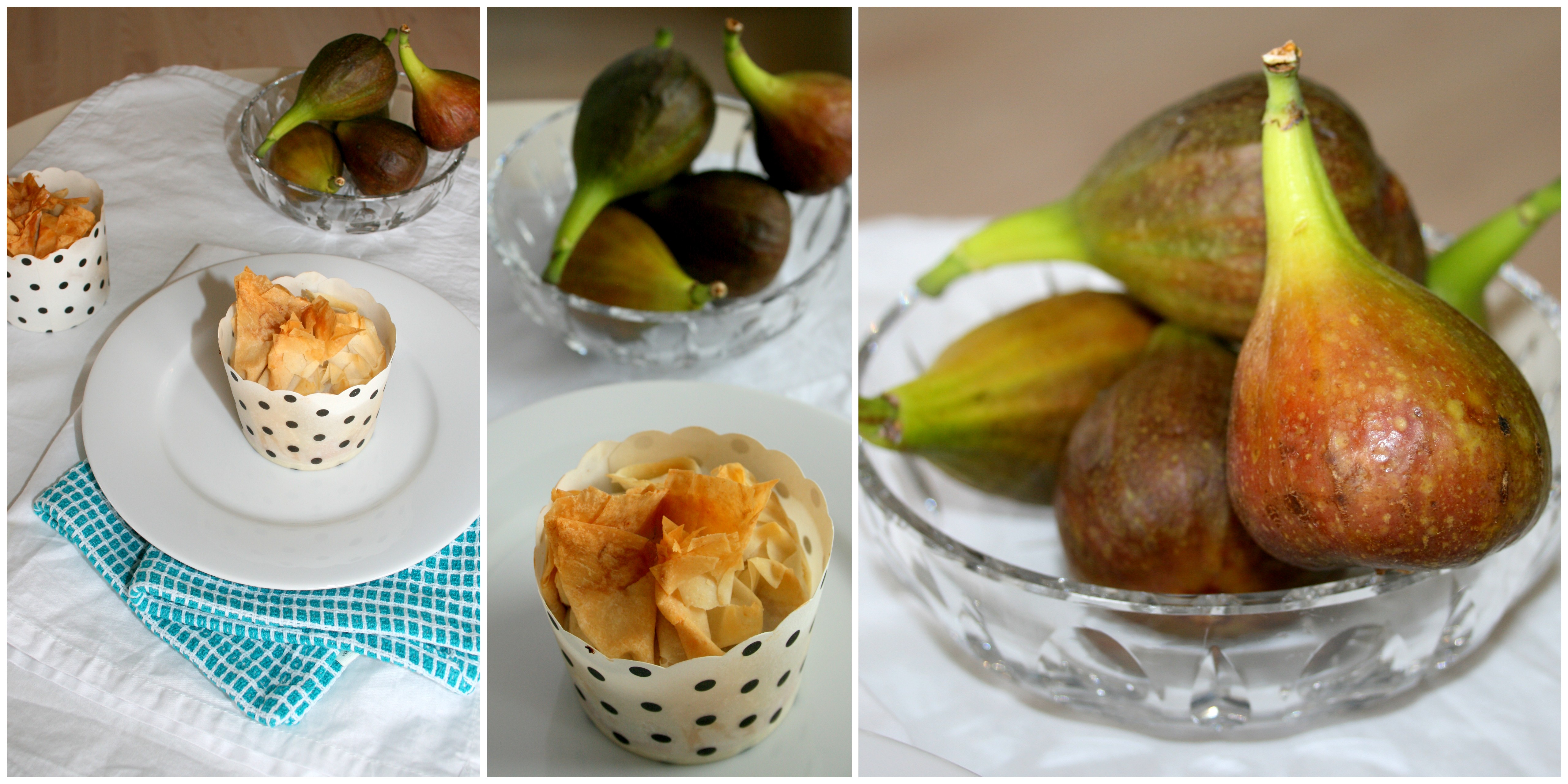 Also wurde aus den Resten gleich noch ein Dessert:Ich habe Feigen geviertelt, mit etwas Honig bzw. Agavendicksaft und Zitronensaft beträufelt, sie auf drei gebutterte Filoteigquadrate gesetzt und diese in Muffinformen.