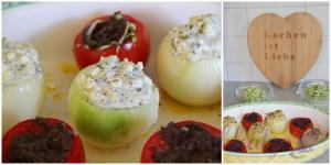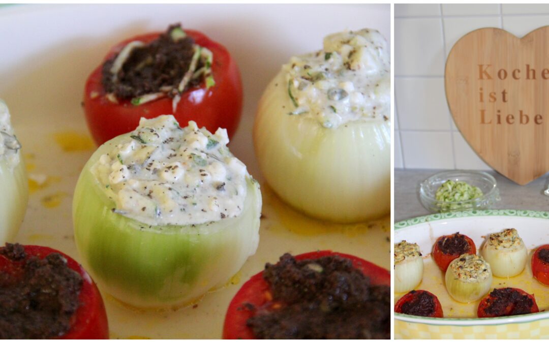 Gefüllte Zwiebeln mit Ofentomaten und Rotwein-Zwiebel-Mousse