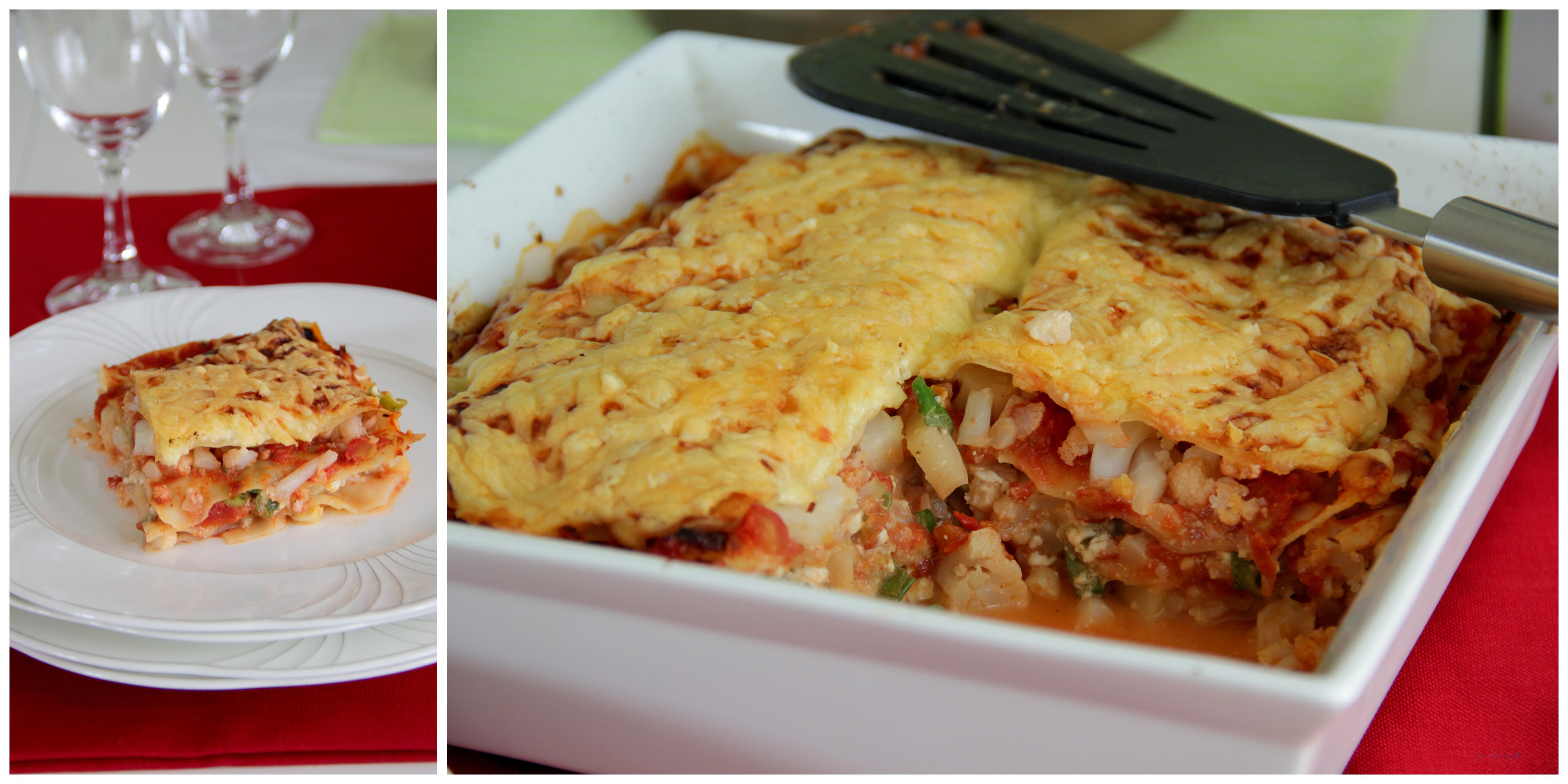 Ich wurde mal wieder von „Resten“ inspiriert. Ein halber Blumenkohl, Lasagneplatten und eine Packung Hüttenkäse Kräuter (eine neue Sorte von Gervais) wurden zu einer schnellen, herzhaft-vegetarischen Lasagne.