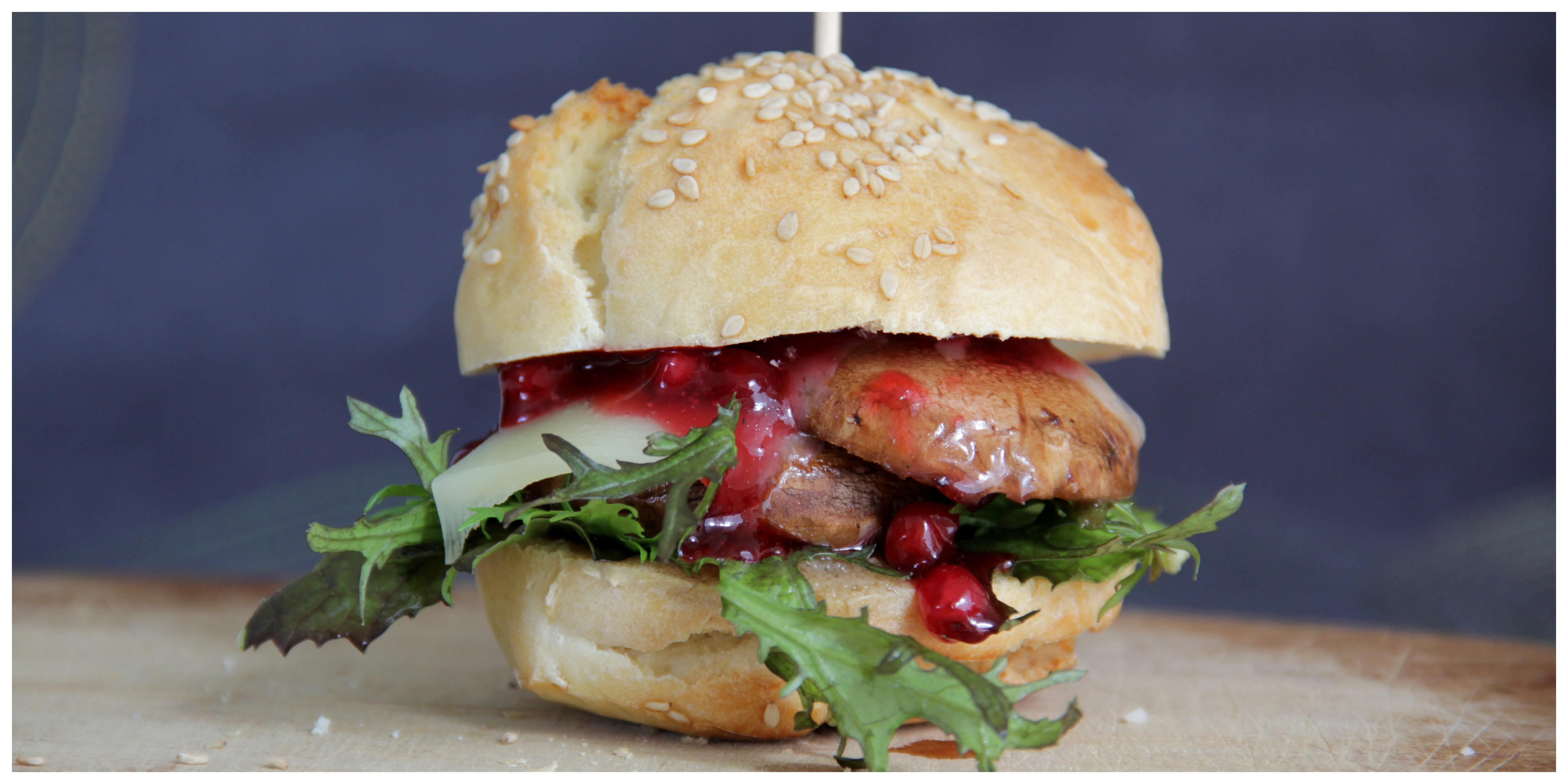Und da wir gerade ein bisschen im Burger-Fieber sind (darüber bald mehr!), gibt es noch eine kleine Idee für ein Abendbrot, beziehungsweise ein Abendbrötchen: Burger mit gebratenem Pilz, Käse und Preiselbeeren.