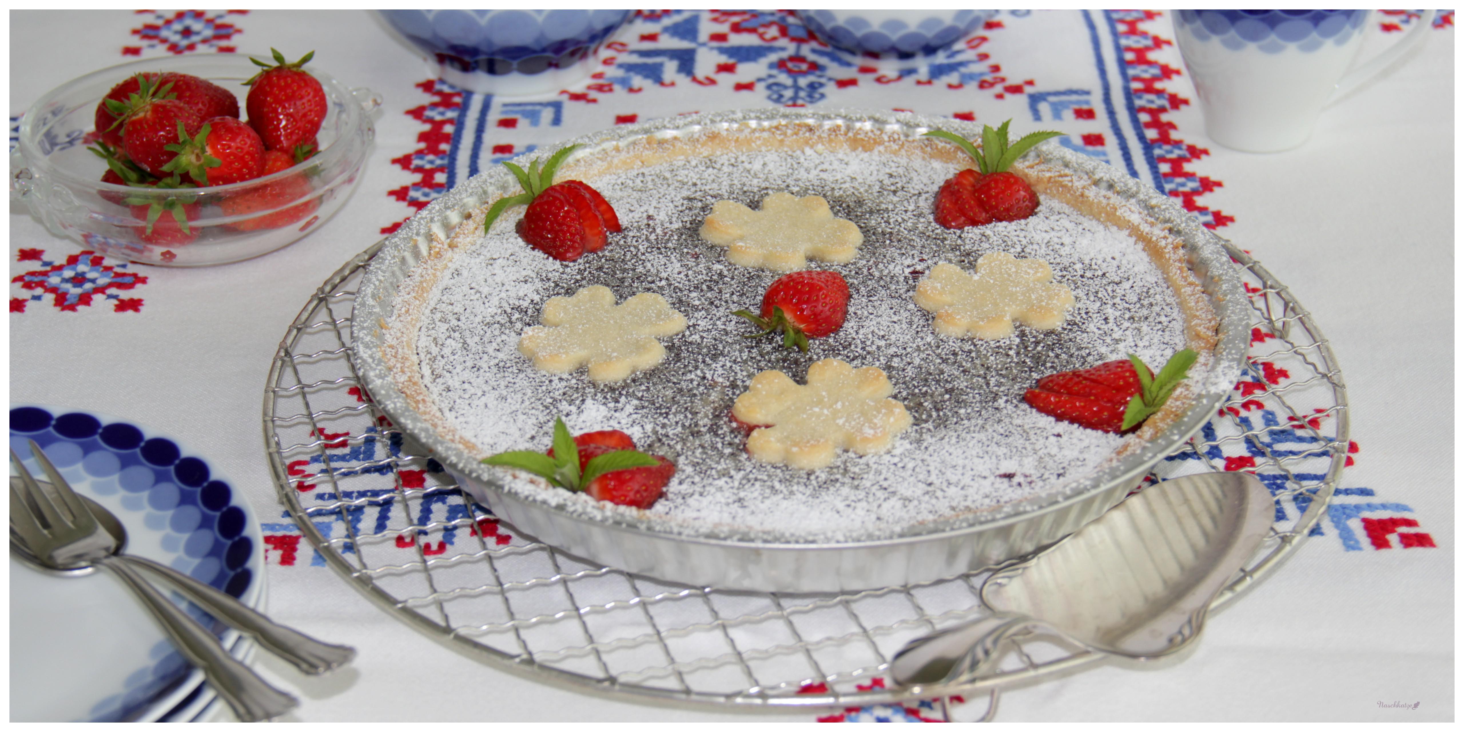 Die Tarte ist eine spontane Neuschöpfung und ich mag die Kombi aus frischen Erdbeeren, die gebacken ein wenig nach Marmelade schmecken und den recht klassischen Geschmack einer Mohnmasse. Wer sie gänzlich vegan haben möchte, kann den Teig des Russischen Zupfkuchens ohne Kakao nehmen.