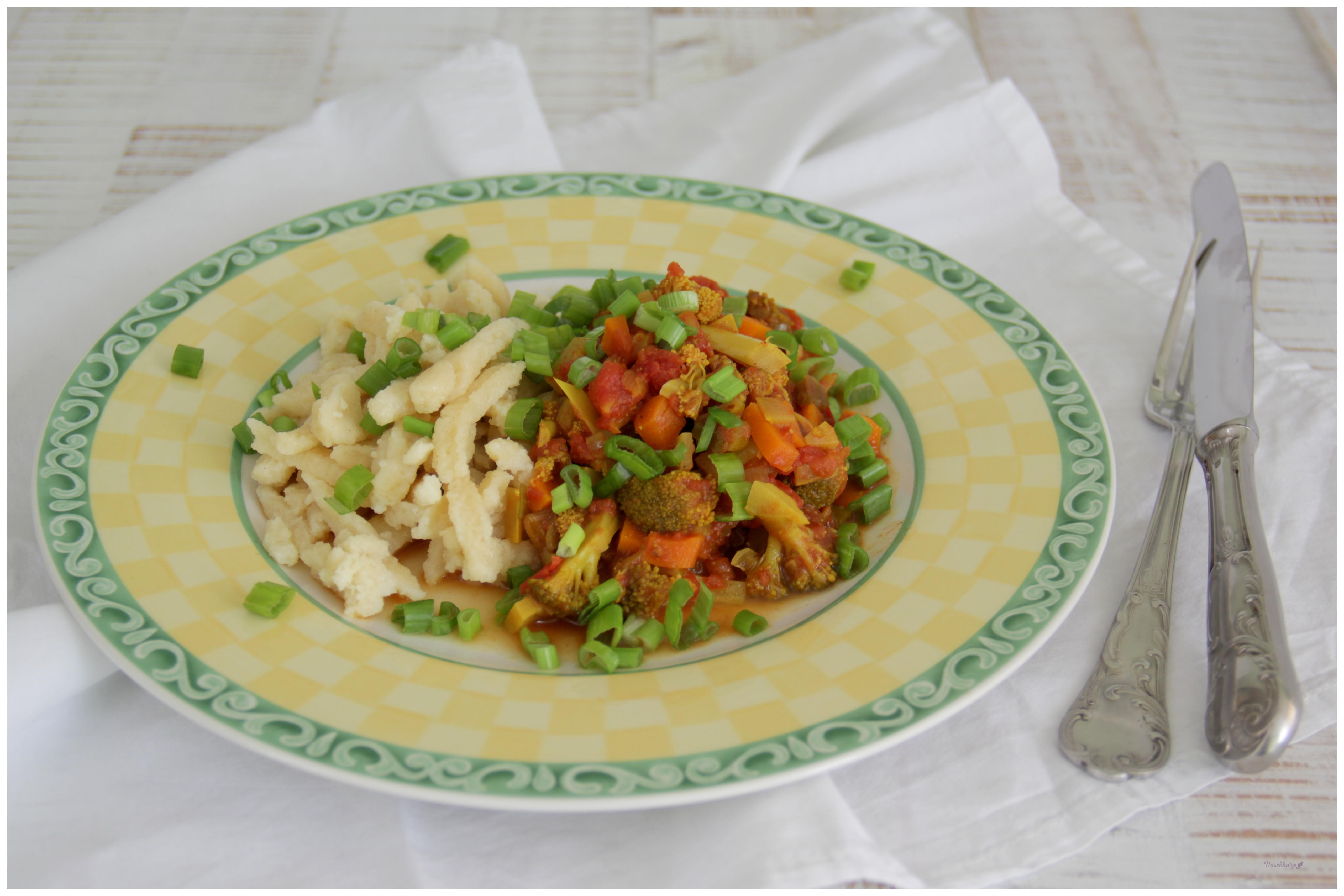 Die Spätzle schmeckten uns so gut und es war kaum ein Unterschied zu den Eierspätzle festzustellen. Der Teig lässt sich genauso ins Wasser schaben und wer das genauso schlecht beherrscht wie ich, der kann sicher auch eine Presse oder einen Spätzleschaber benutzen.