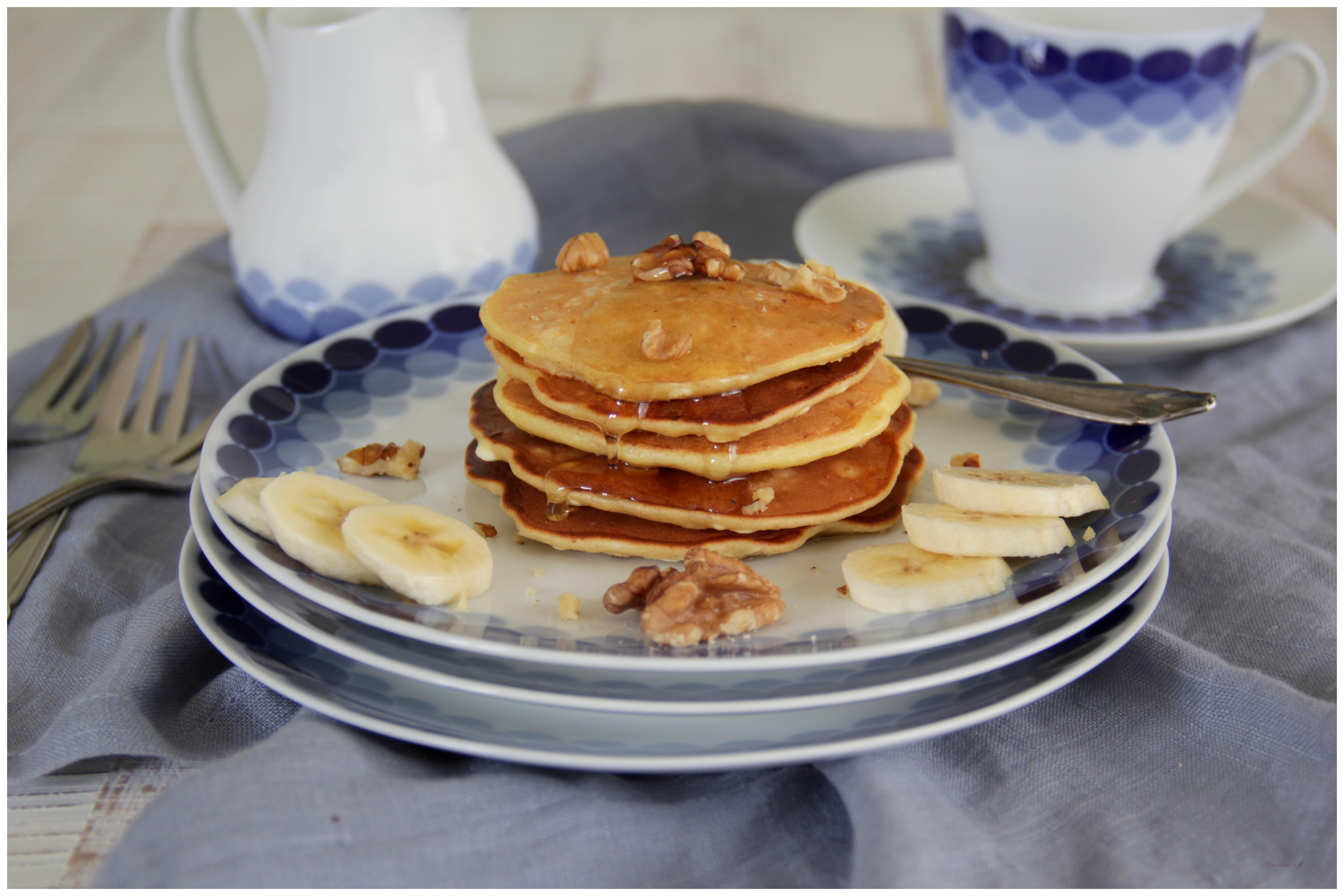 Mit Sirup, grob gehackten Walnüssen und Banane servieren.