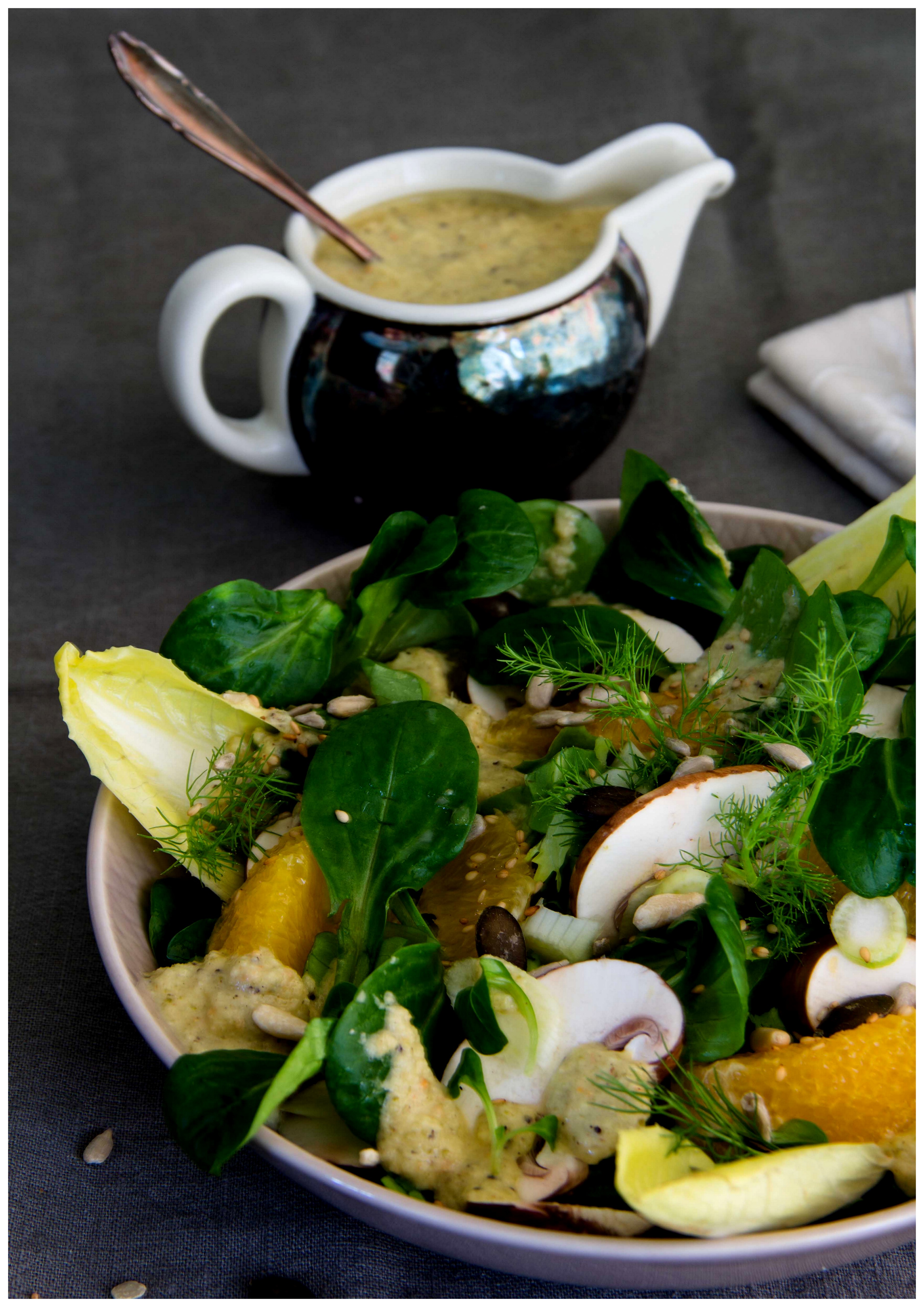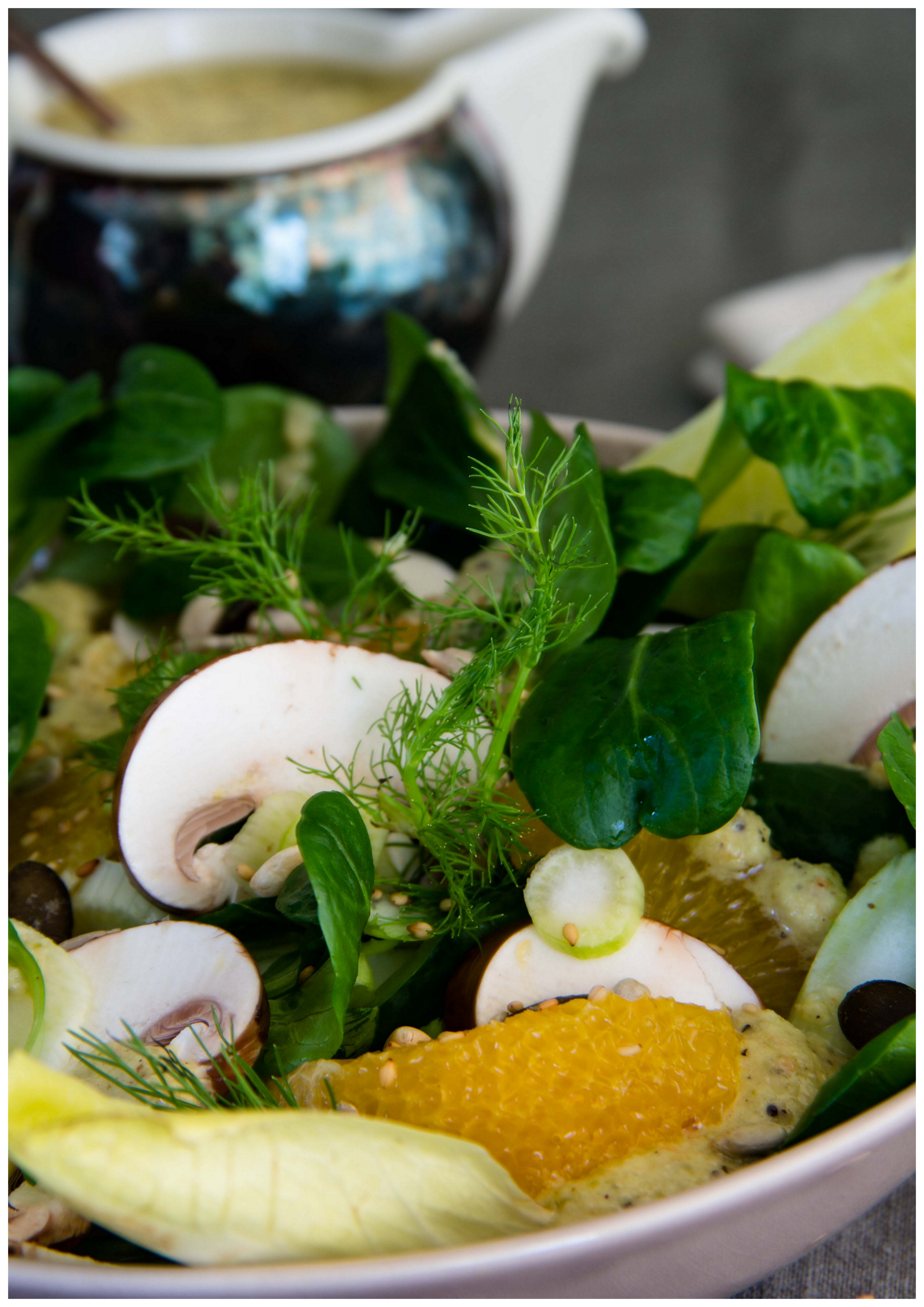 Ich habe heute mal wieder was Herzhaftes für euch. Und im Hinblick auf die Festtage, an denen man ja oft etwas Neues oder Besonderes zubereitet, möchte ich euch diesen bunten Wintersalat mit Orange, Fenchel, Pilzen und einem ganz besonderen Dressing nicht vorenthalten. Die Soße haben meine Ma und ich letztes Wochenende nach dem Rezept einer Freundin gemacht, als wir zu einer Feier einen Salat mitbringen sollten.