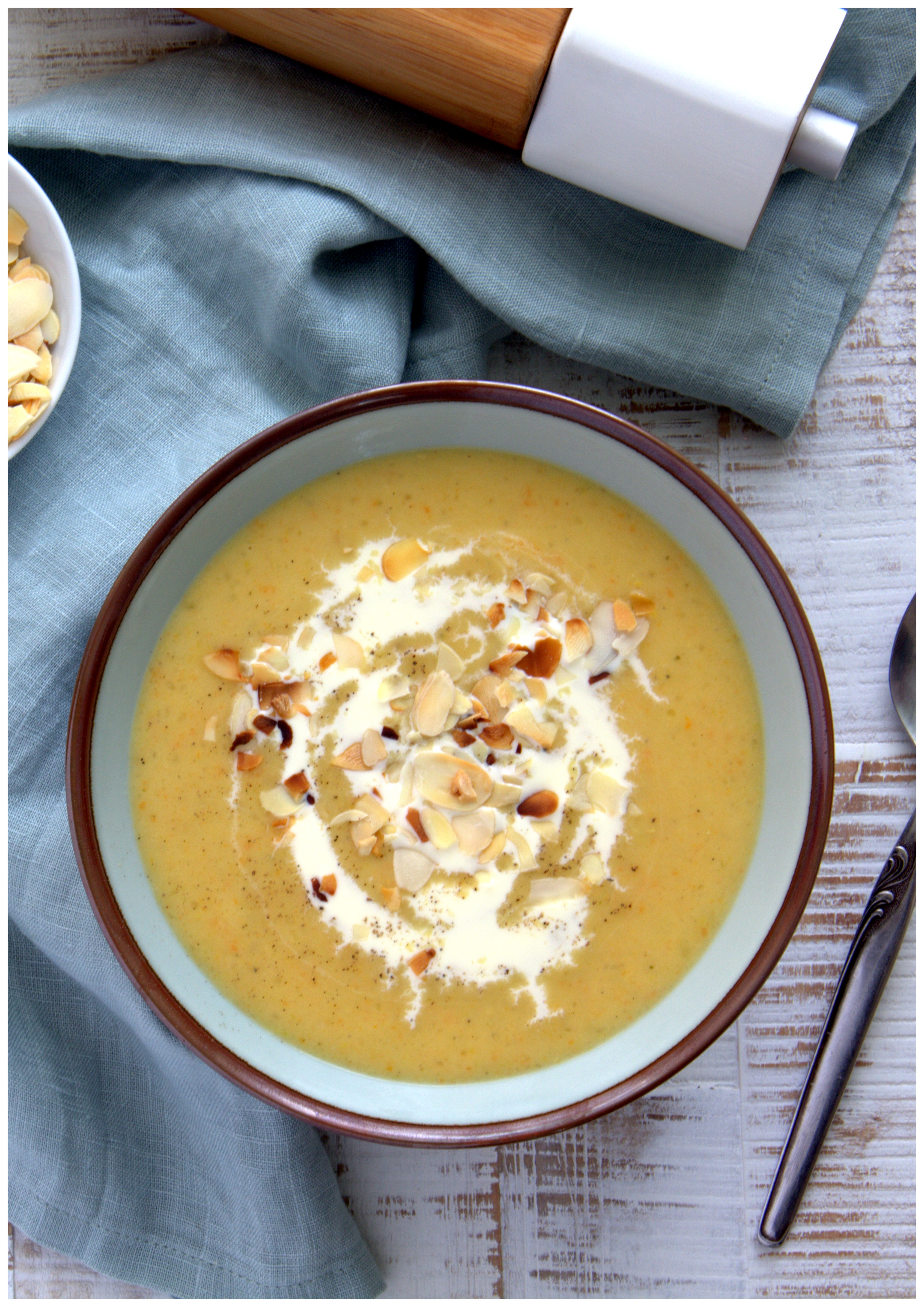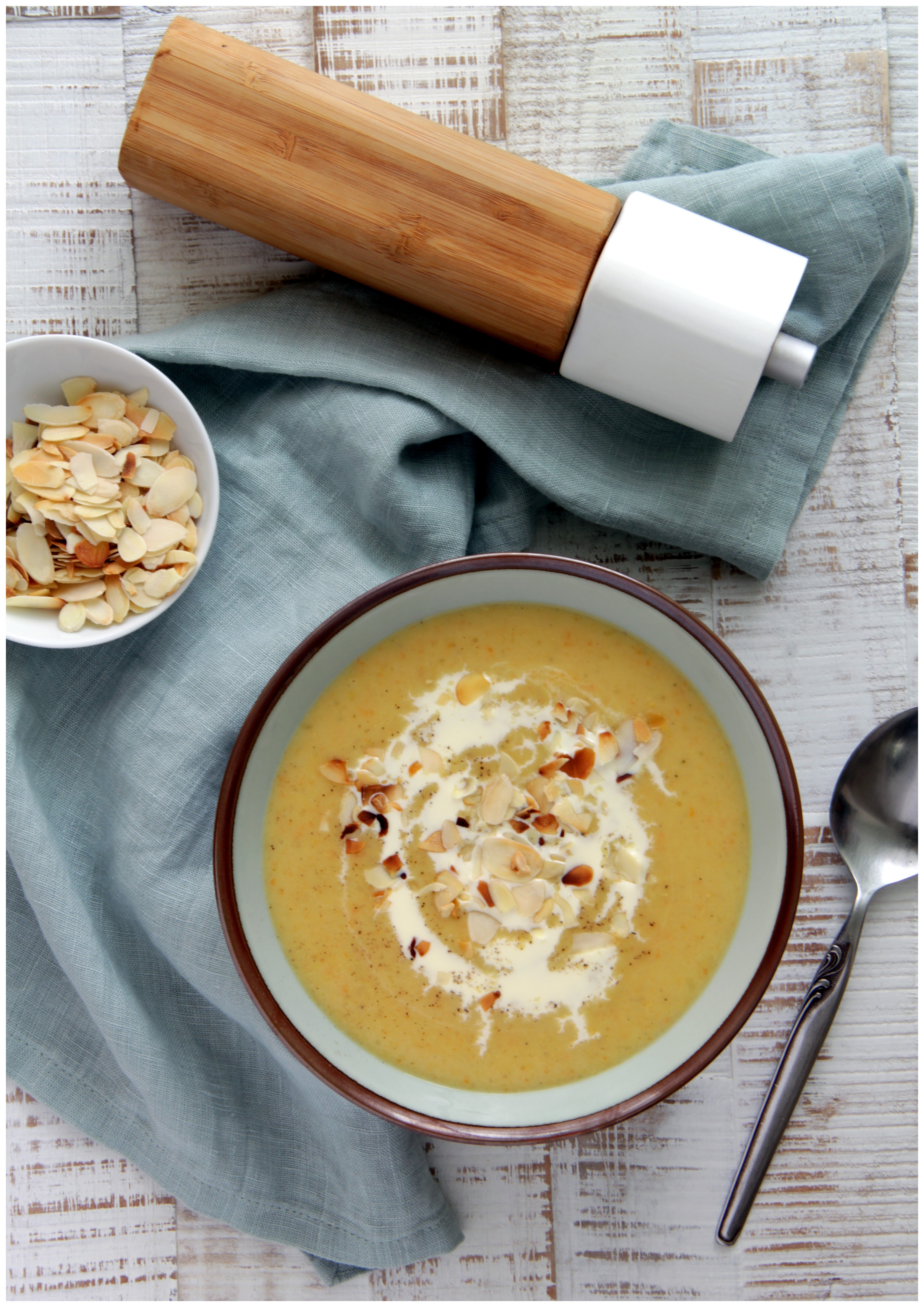 Die Suppe auf Teller verteilen und geröstete Mandelblättchen über jede Portion streuen.