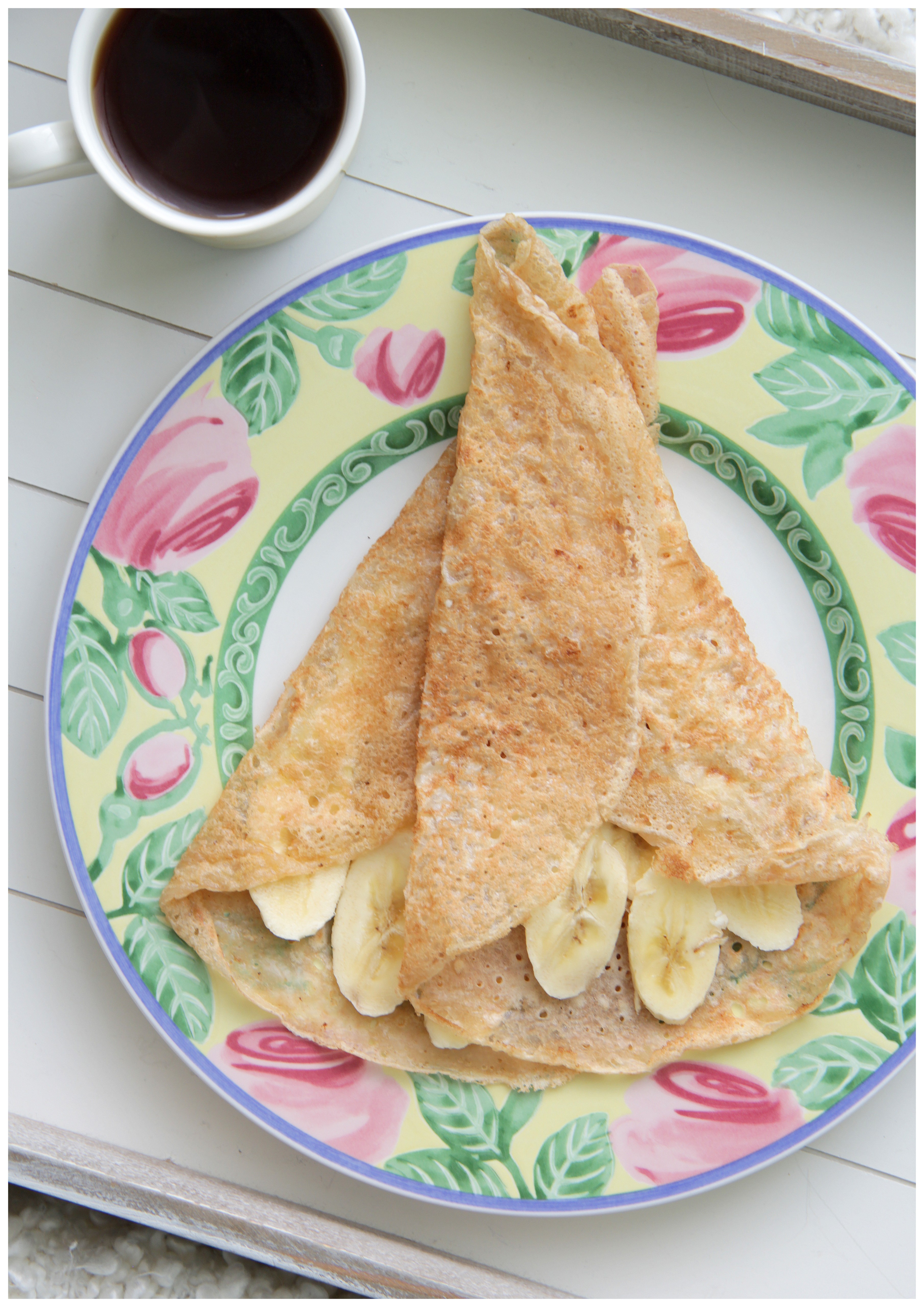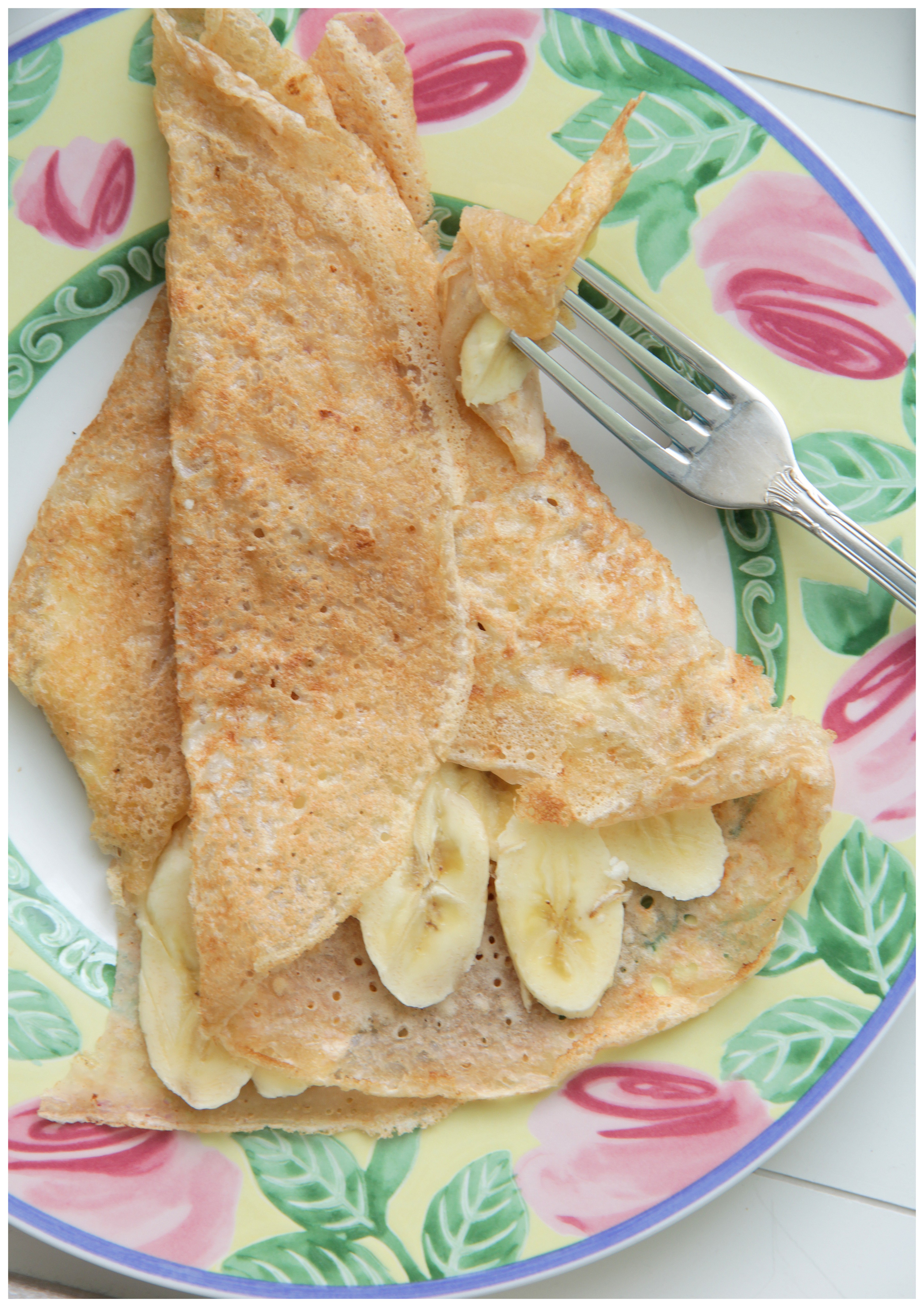 Sehr gut schmeckt eine Füllung aus Banane, aber man kann auch dünn Nugatcreme oder Marmelade darauf streichen und die Crêpes einrollen oder hübsch einklappen.
