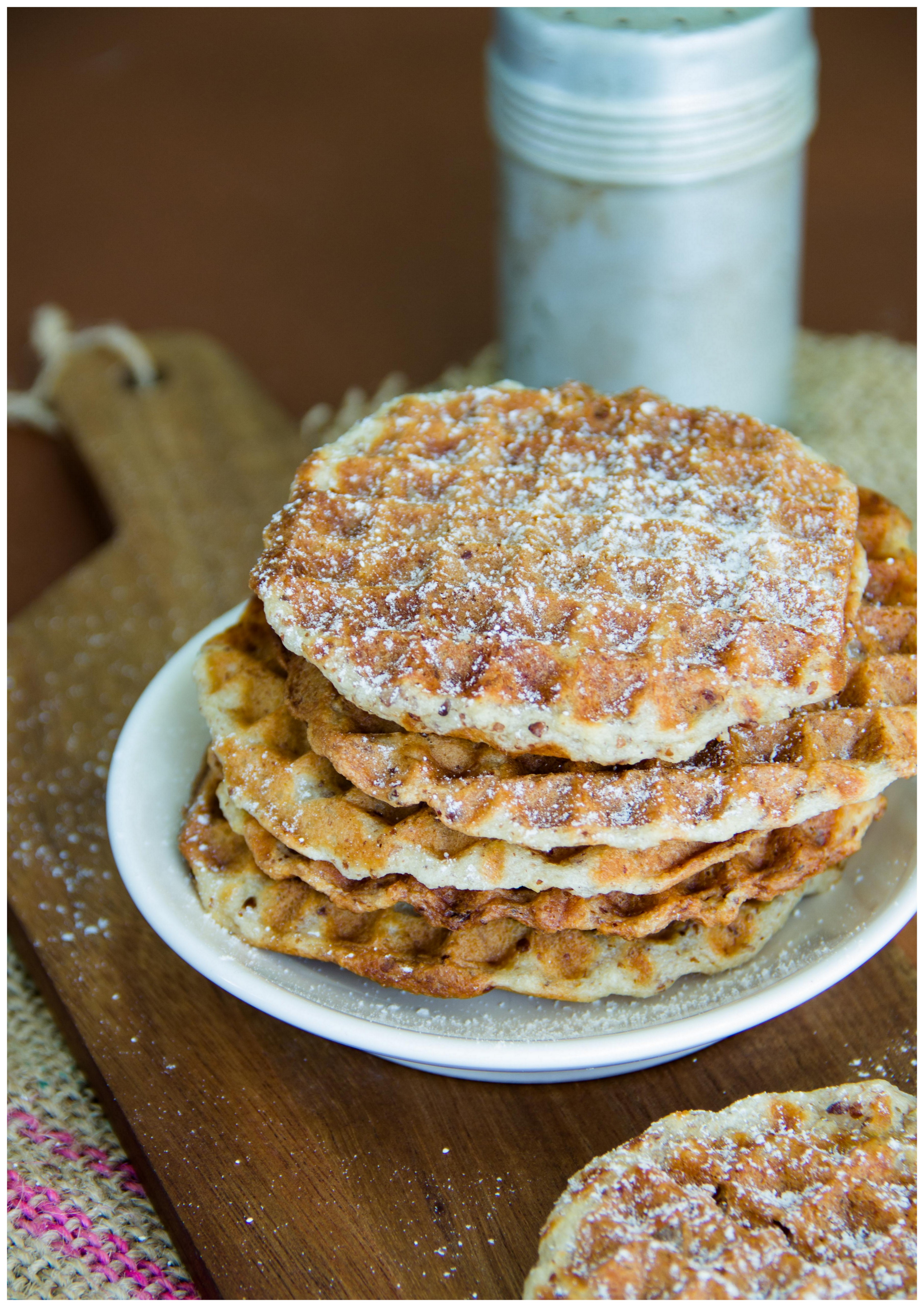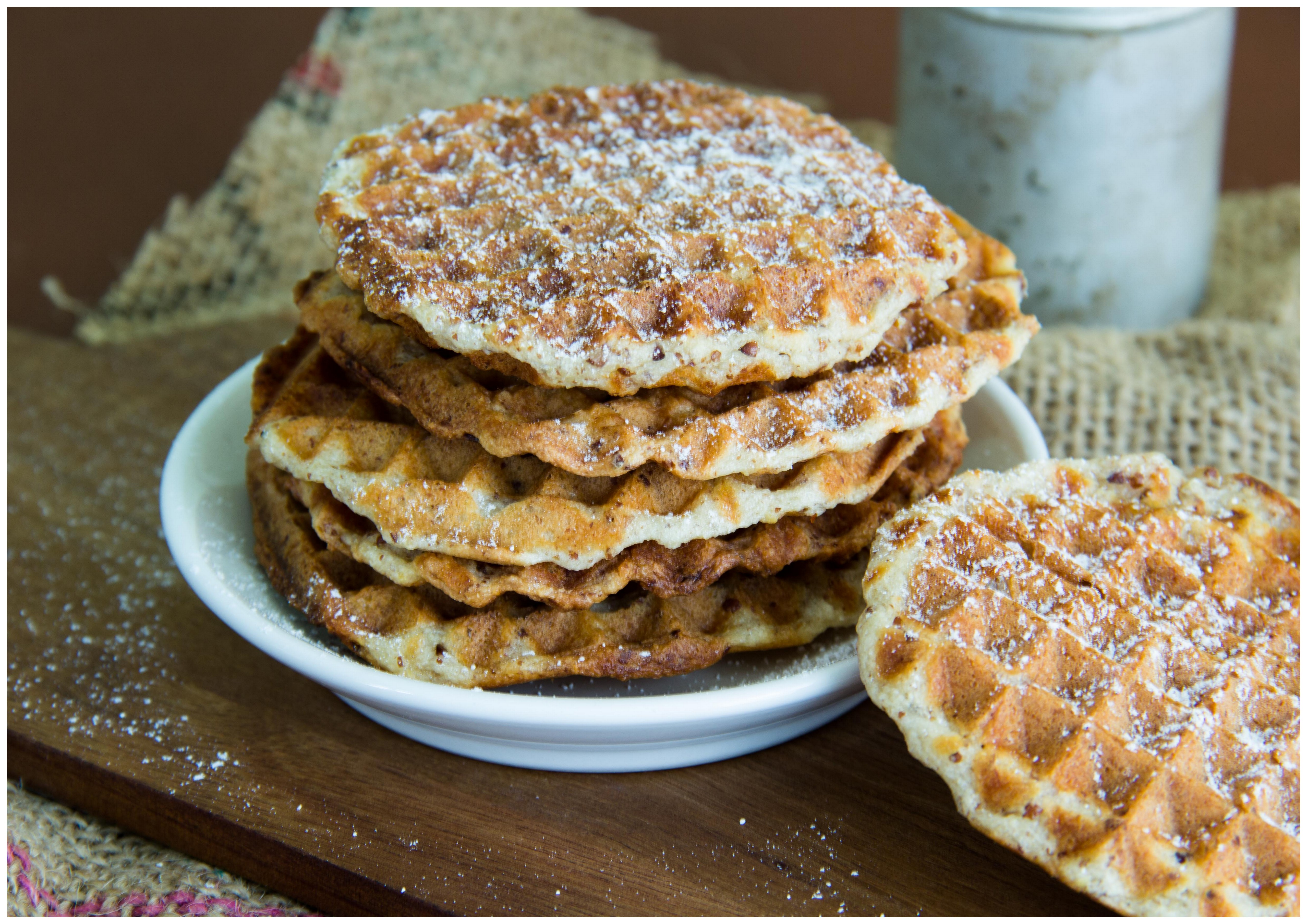 Ich empfehle also, kein belgisches Eisen für dicke Waffeln zu verwenden – das könnte mit diesem Teig misslingen – und die Waffeln grundsätzlich sehr dünn zu backen.