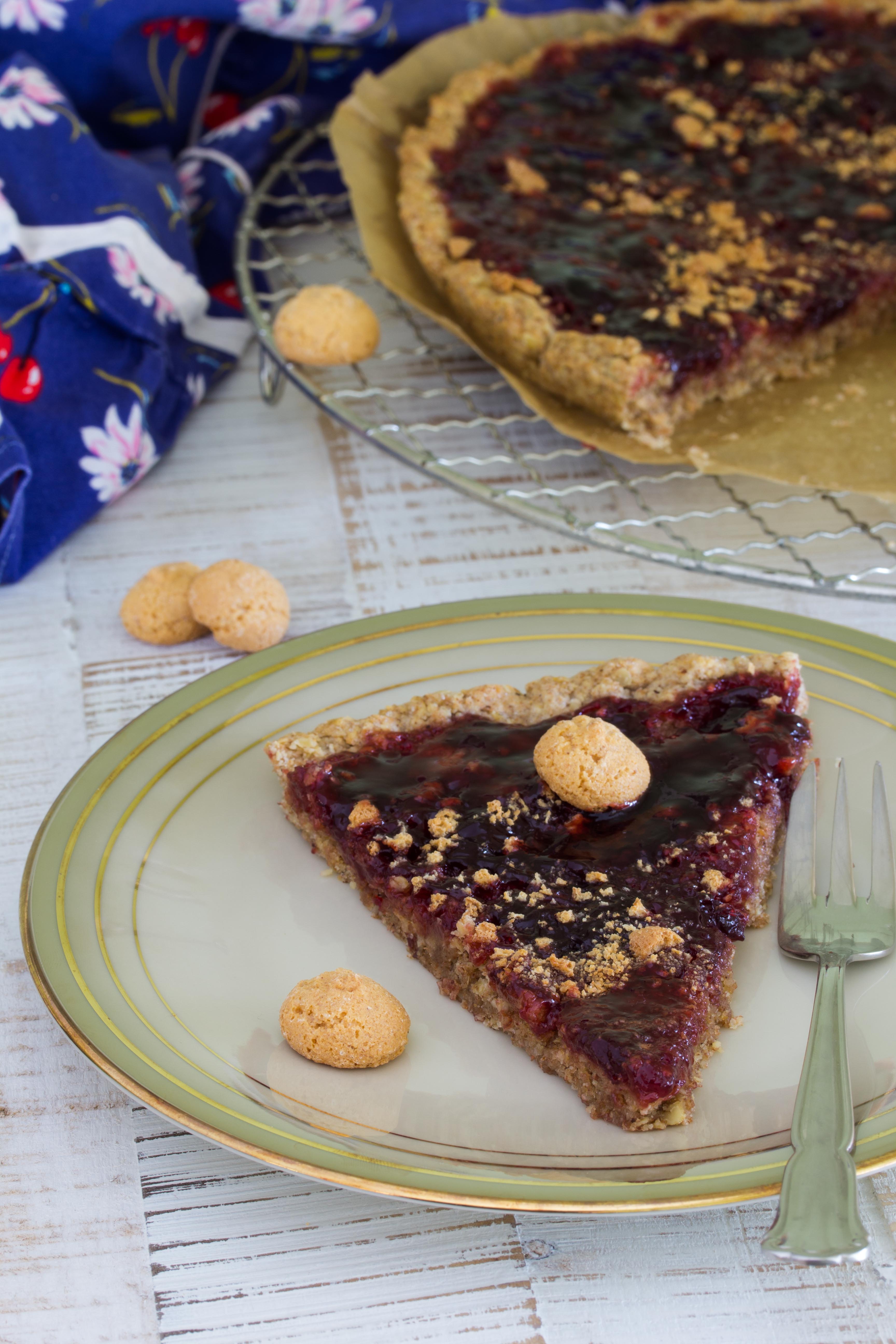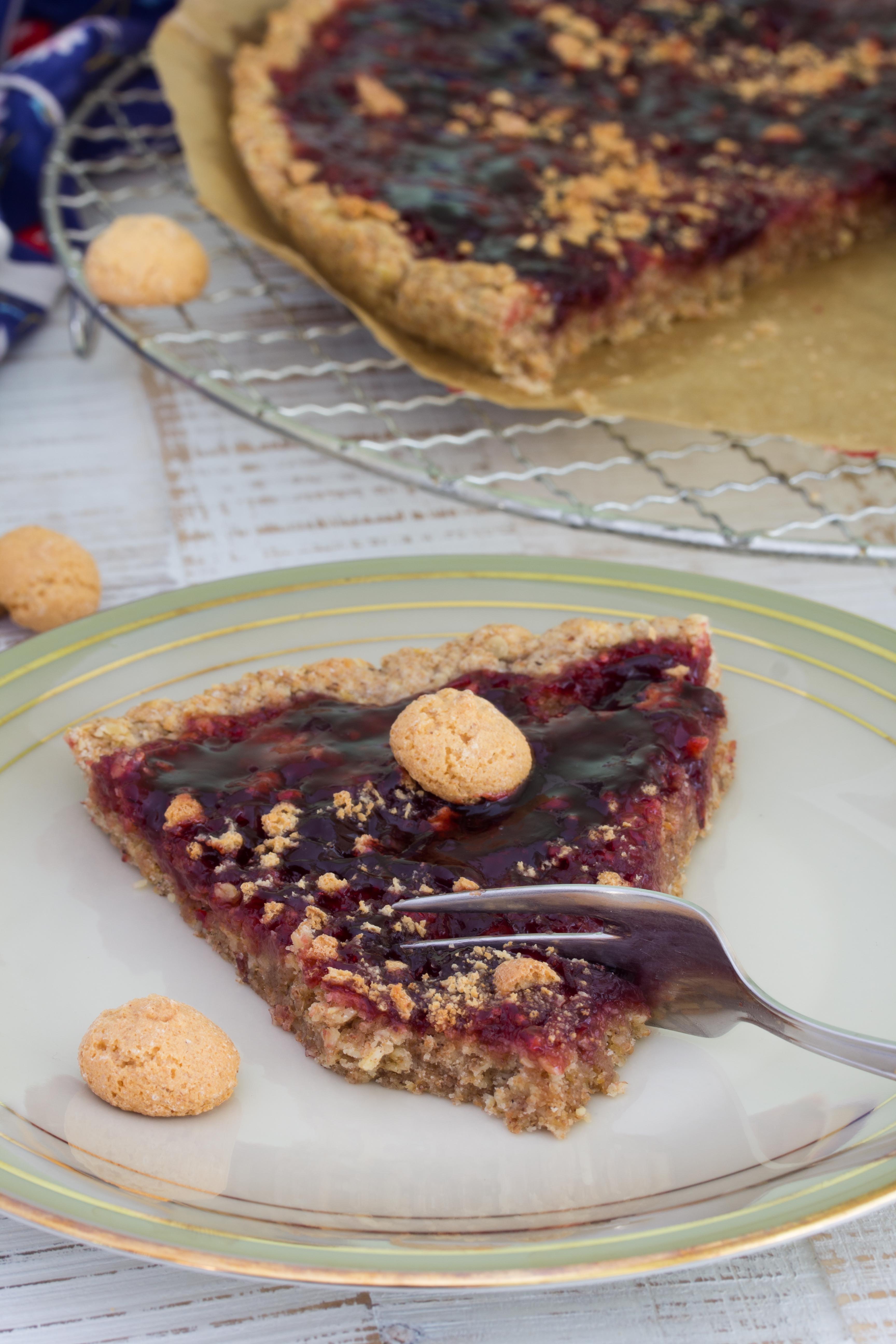 Ein Teigmuster auf der Konfitüre habe ich mir gespart, denn der Teig schien mir mit den Haferflocken nicht so geeignet zum Ausrollen, Schneiden oder Ausstechen. Dafür habe ich dann die Amarettini darüber gebröselt, die passen super zum Amaretto im Teig und mit der Sauerkirsche schmeckt der Kuchen wir ein Amarenakirschkuchen. Wir fanden ihn absolut köstlich! Ich hoffe, ihr auch!