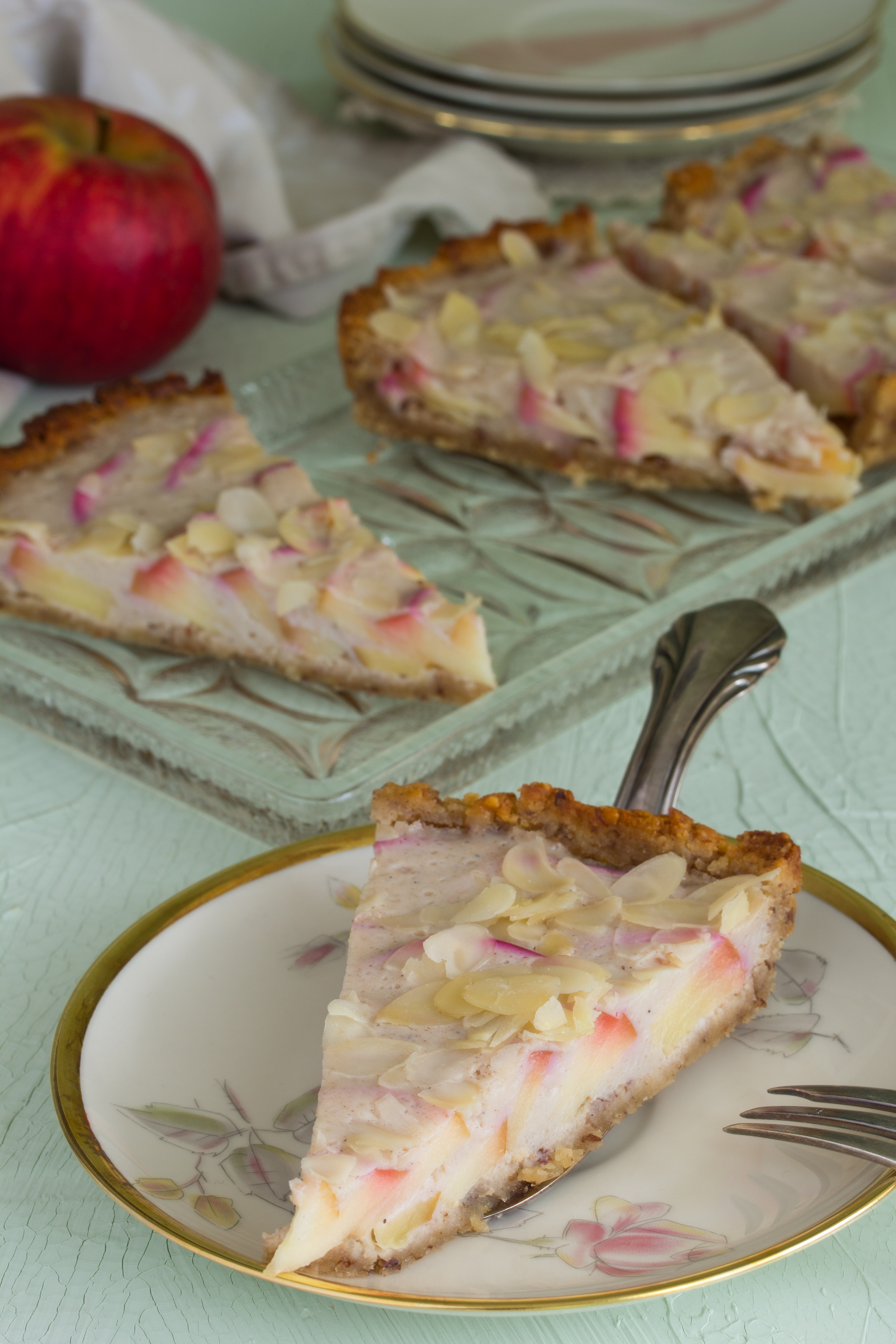 Die Äpfel waschen, trocknen und halbieren. Das Kerngehäuse entfernen und die Äpfel in Scheiben oder feine Spalten schneiden. Die Stücke in Kreisen und überlappend auf den Teigboden setzen, bis er komplett mit einer Schicht Apfel bedeckt ist. Den Guss darüber gießen und die Mandelblättchen darüber streuen (die Mandeln werden beim Backen nicht braun, wer das gerne mag, nimmt welche, die bereits leicht geröstet sind).
