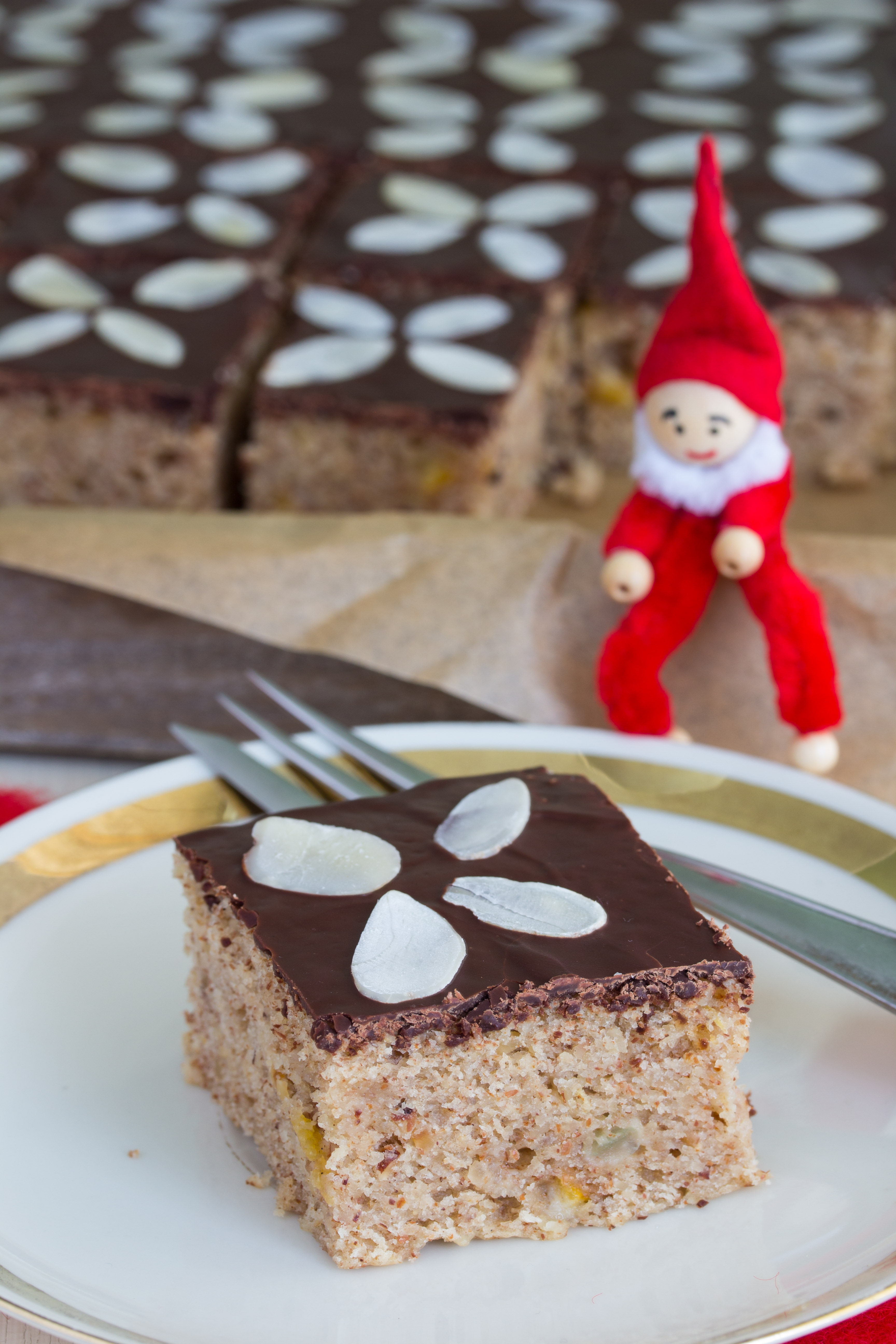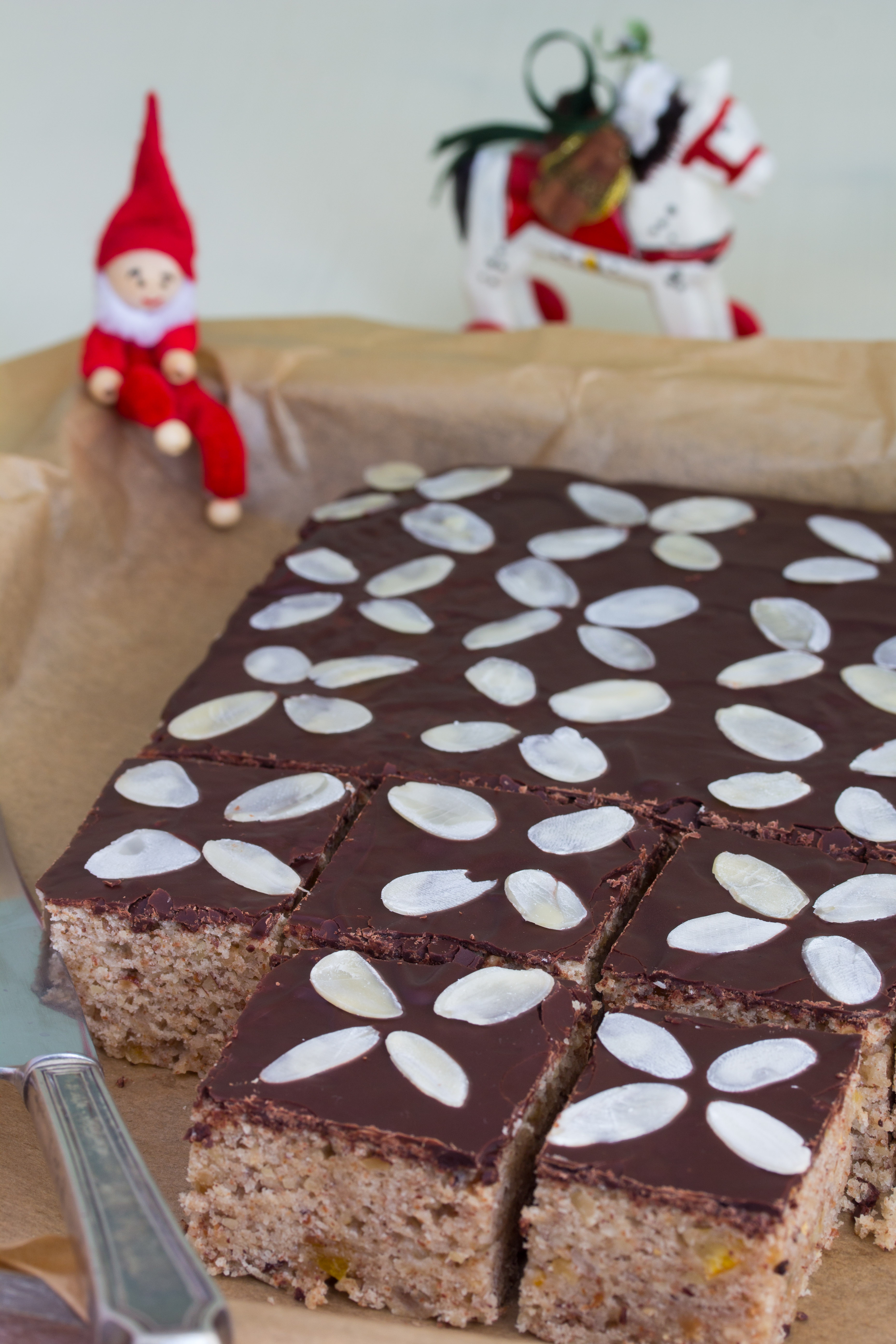 20 Minuten backen, dann herausnehmen und etwas abkühlen lassen. Den Kuchen stürzen, das Backpapier abziehen und den Kuchen vollständig abkühlen lassen. In der Zwischenzeit die Kuvertüre schmelzen und auf den erkalteten Kuchen streichen. Mit Mandelblättchen ein hübsches Muster legen. Wenn die Kuvertüre fest ist, kleine Schnitten schneiden.