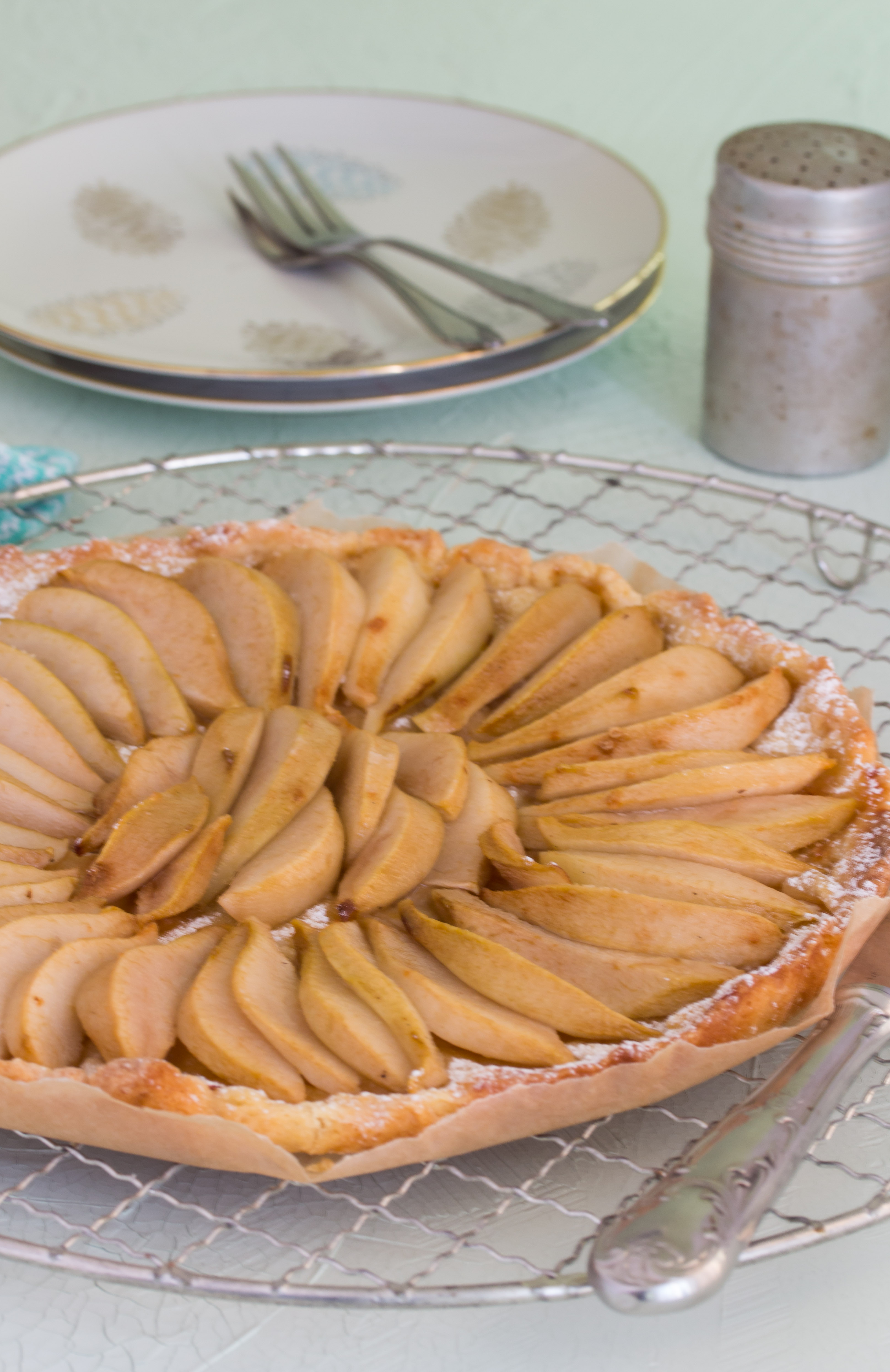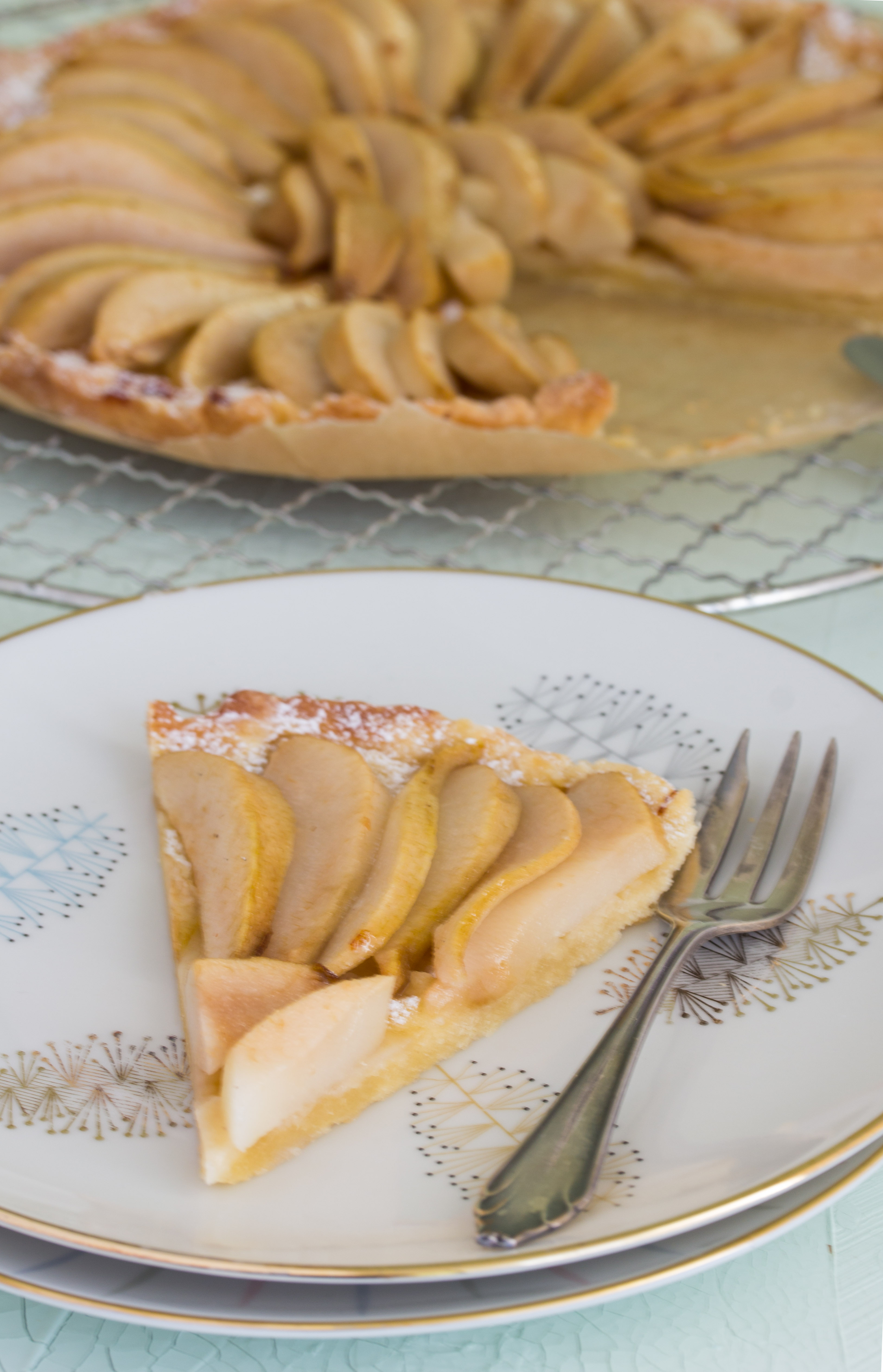 Sollte machbar sein, dachte ich und legte los. Ein zarter Mürbteig mit Puderzucker, darauf Birnen. Die erste Version war köstlich, aber der Teig in der Mitte nicht durch. Also backte ich heute noch mal und diesmal entspricht das Ergebnis meinen Ansprüchen.