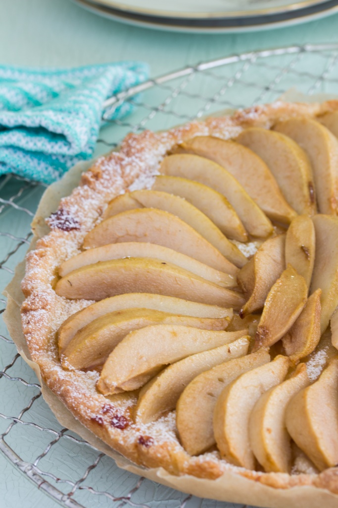 Den Boden aus dem Ofen nehmen, das Papier entfernen und die Birnen leicht überlappend und möglichst eng auf dem Teig verteilen. Die Früchte mit dem Gelee bestreichen und die Tarte 20–25 Minuten backen, bis die Birnen weich sind und der Teig goldbraun ist. Sollte der Rand zu stark bräunen, die Birnen aber noch nicht weich sein, die Tarte mit Backpapier abdecken und weitere 5 Minuten backen.
