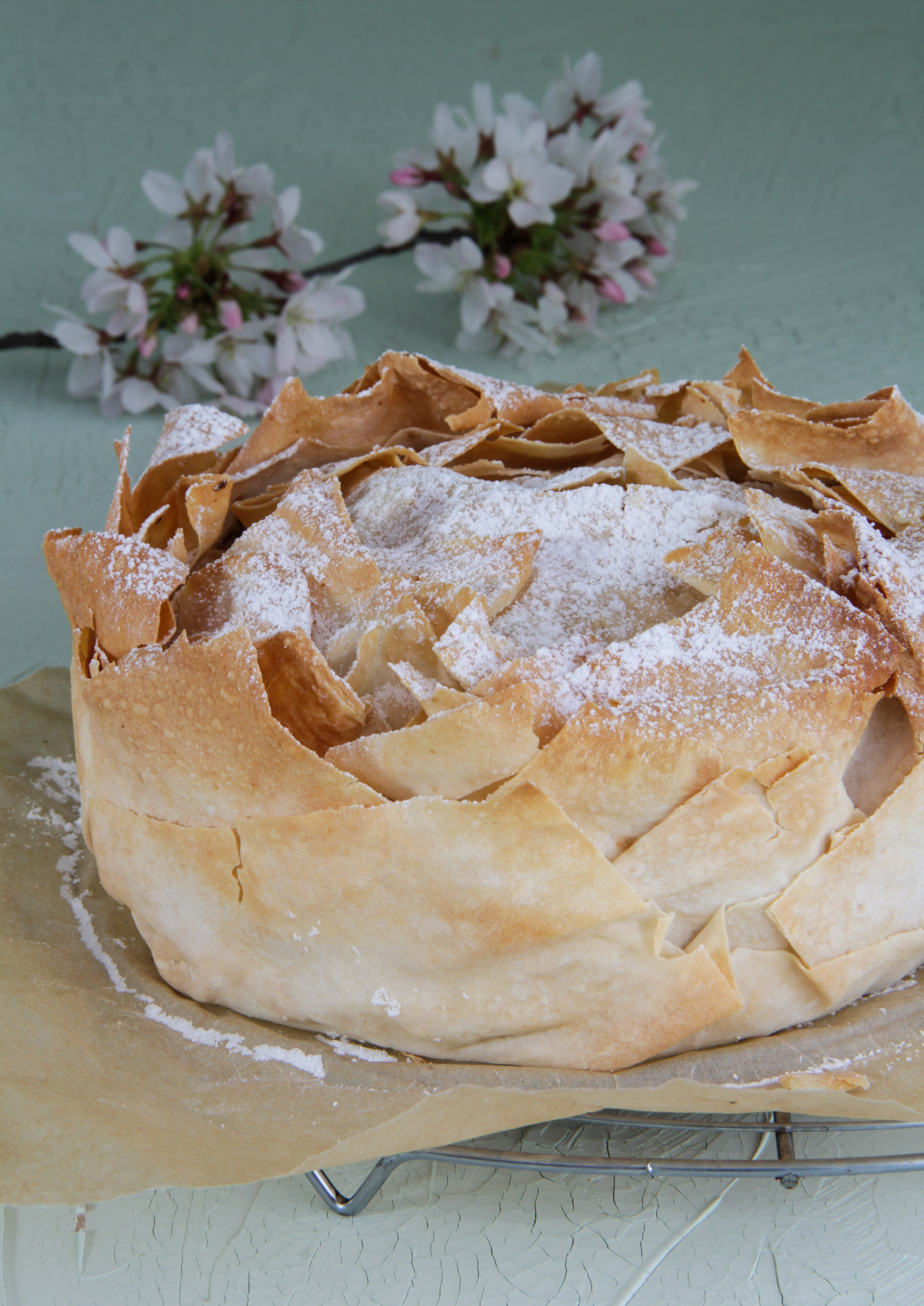Nach diesem köstlichen Mittagessen ging es in meine eigene Küche. Ich wollte endlich mal den Filoteig verbacken, den ich vor 2 Wochen gekauft hatte. Leider war er nicht mehr ganz frisch und brach an den Faltkanten auseinander, weshalb ich dann umdisponierte und eine kleinere Form nahm, für die die verbleibenden Teigquadrate groß genug waren. Aber im Endeffekt passte das so ganz gut und heraus kam – wie ich finde – ein zauberhafter Kuchen, der mit seiner knusprigen Luftigkeit, den frischen Äpfeln und dem Hauch von Rosenwasser Frühlingsgefühle aufkommen lässt.