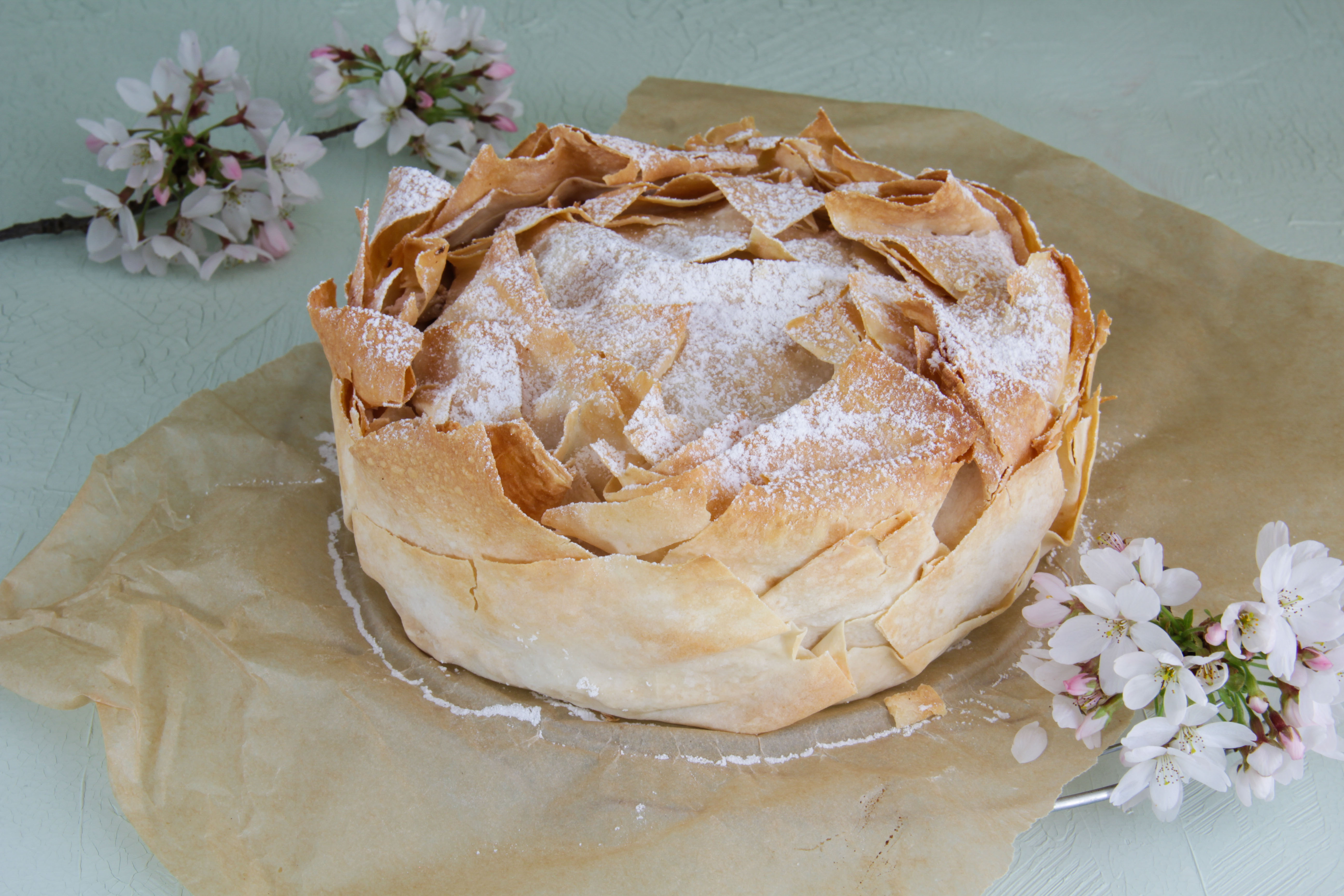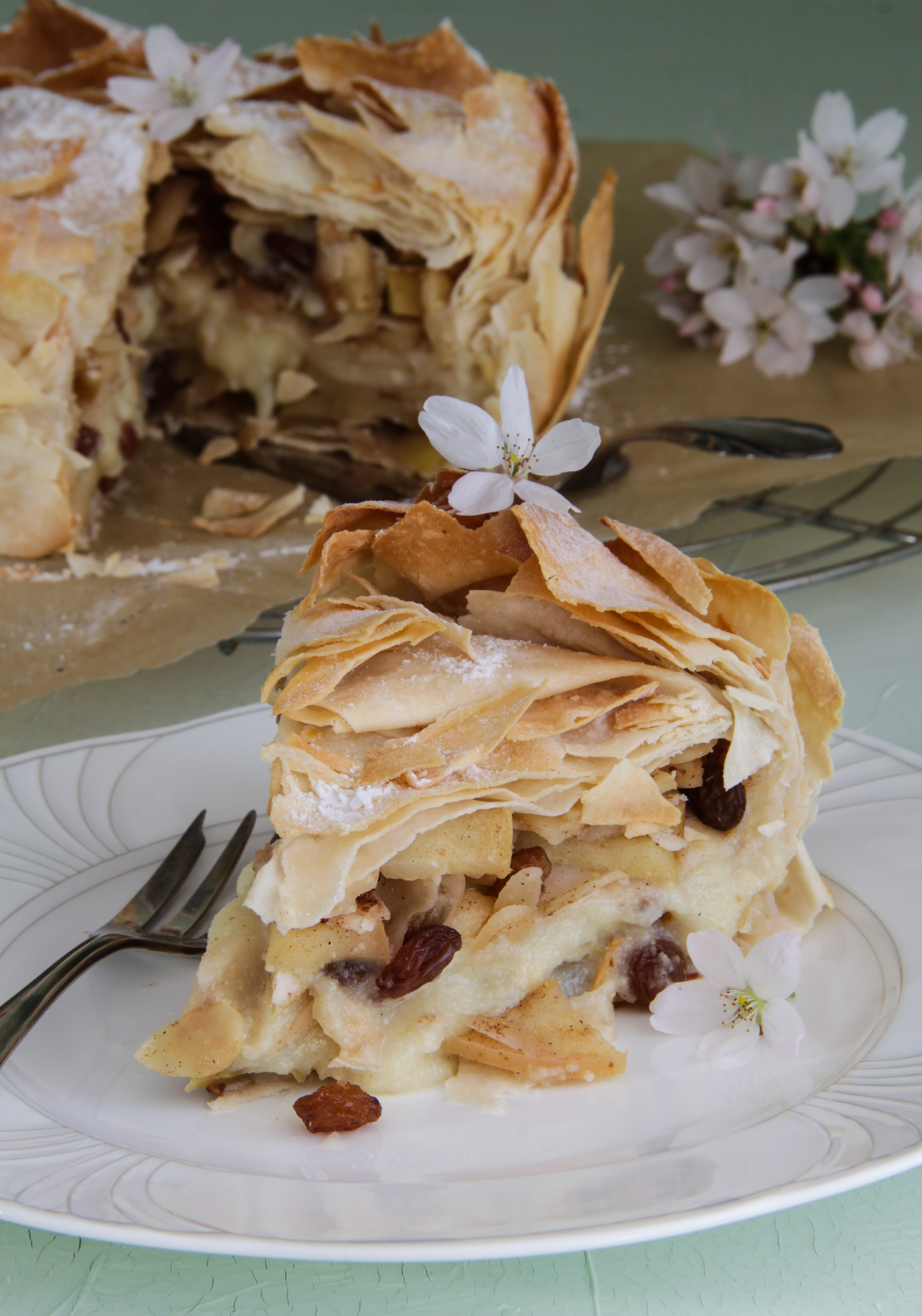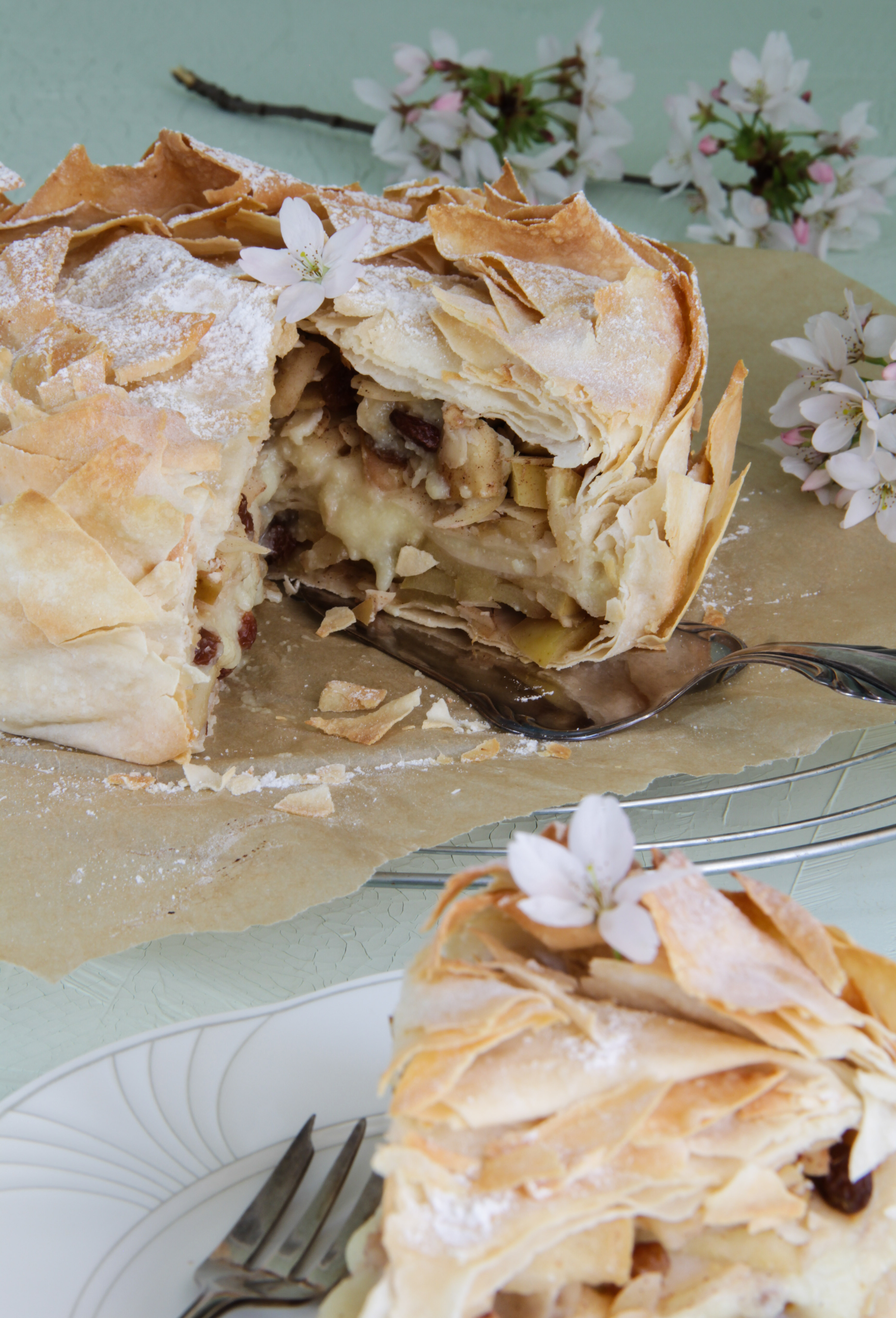 Apfelkuchen mit Filoteig & Rosen-Grieß-Creme (vegan)