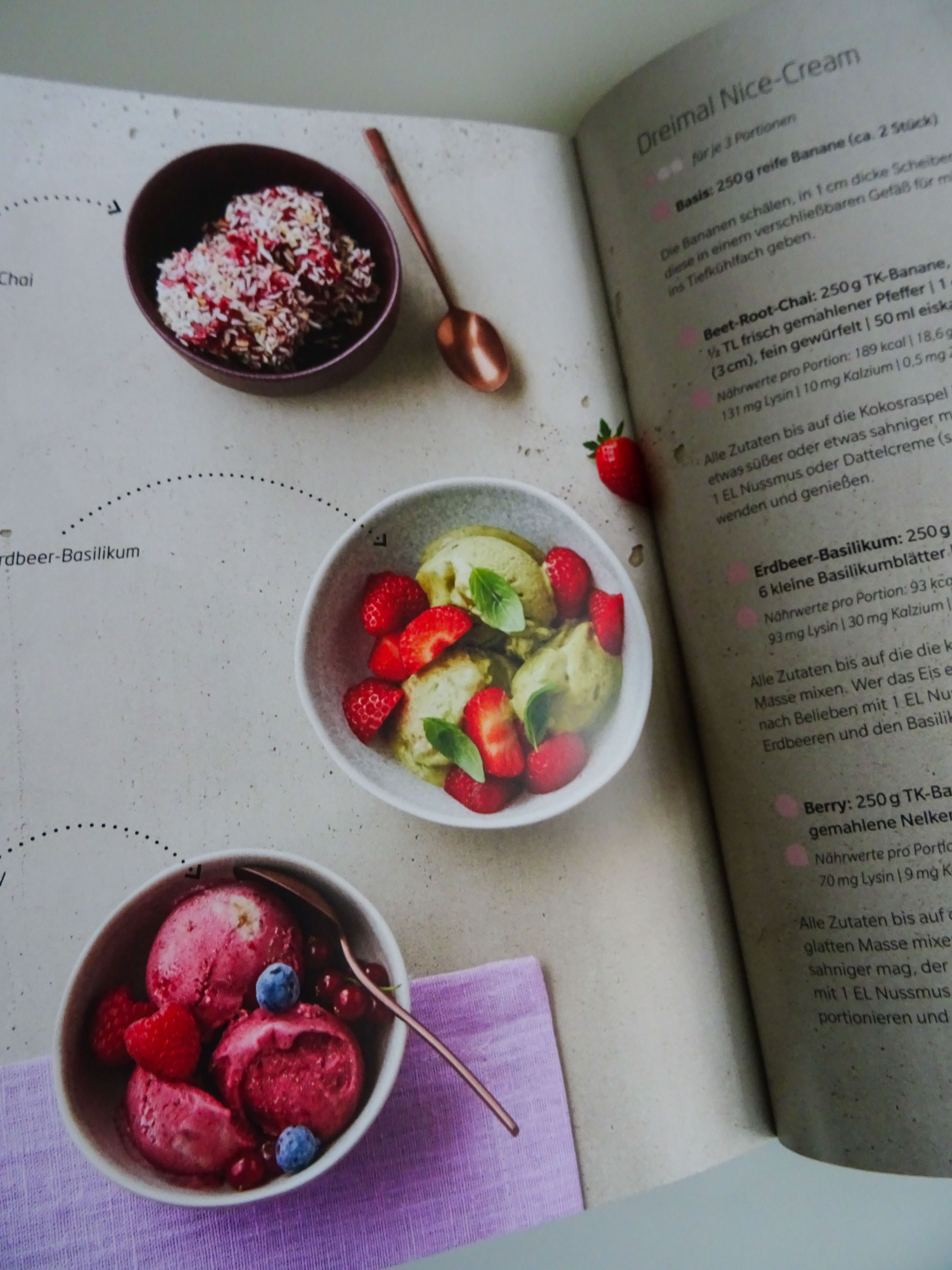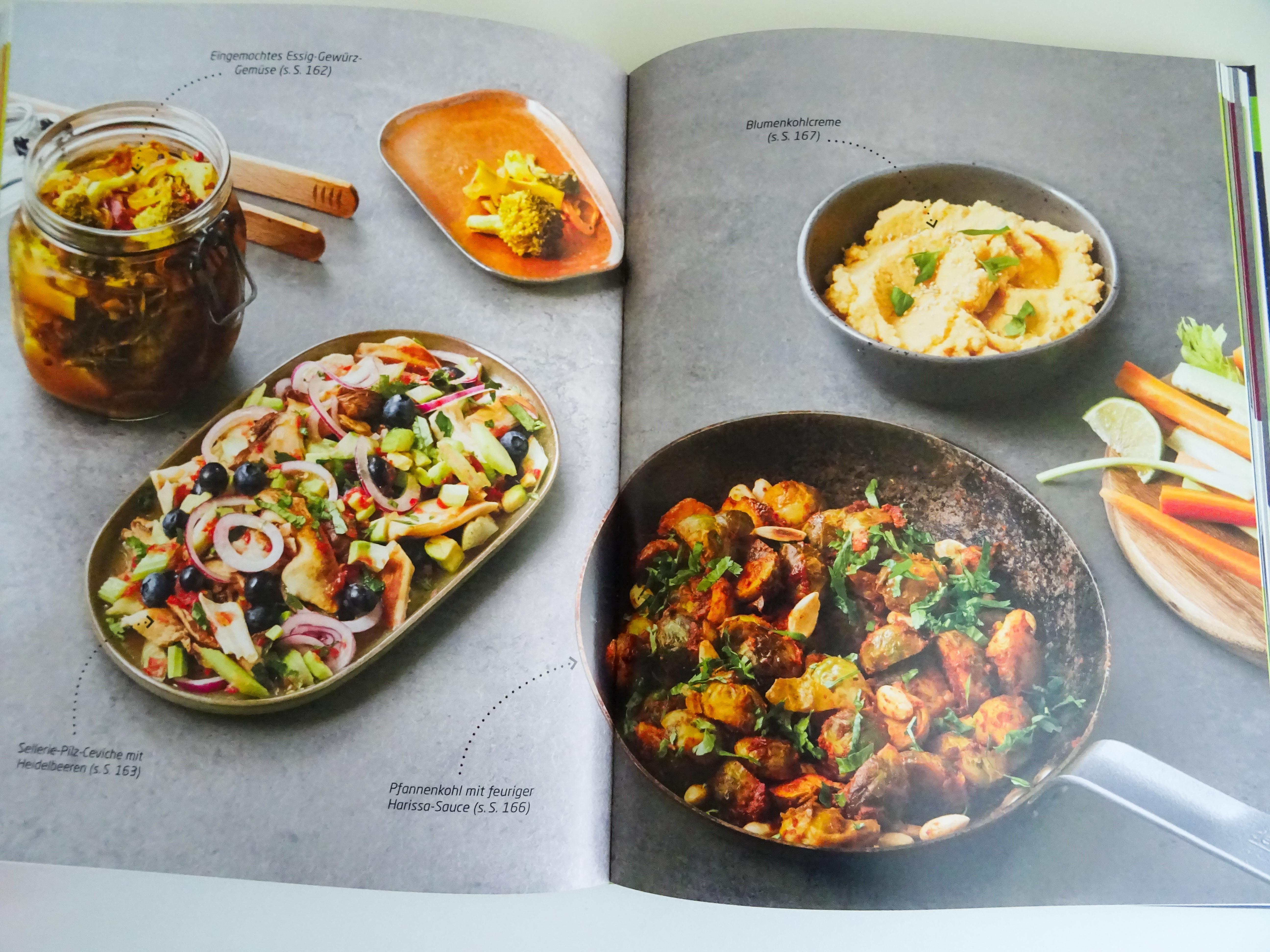 Sofort angesprochen hat mich das „Sellerie-Pilz-Ceviche mit Heidelbeeren“, das ich dann mit vorhandenen Zutaten und somit stark abgewandelt auch direkt ausprobiert habe. Auch wenn ich Tempeh nicht wirklich mag, würde ich trotzdem das „Grünes Pfeffer-Tempeh-Rahmgeschnetzelte“ ausprobieren. Der „Mediterrane Bohnensalat“ klingt wunderbar sommerlich und der „Vietnamesische Kräutersalat“ macht Lust auf asiatisches Blattgrün. Auch lecker: „Geröstetes Süßkartoffelpüree mit Tahin-Salsa“. Macht Hunger, oder?