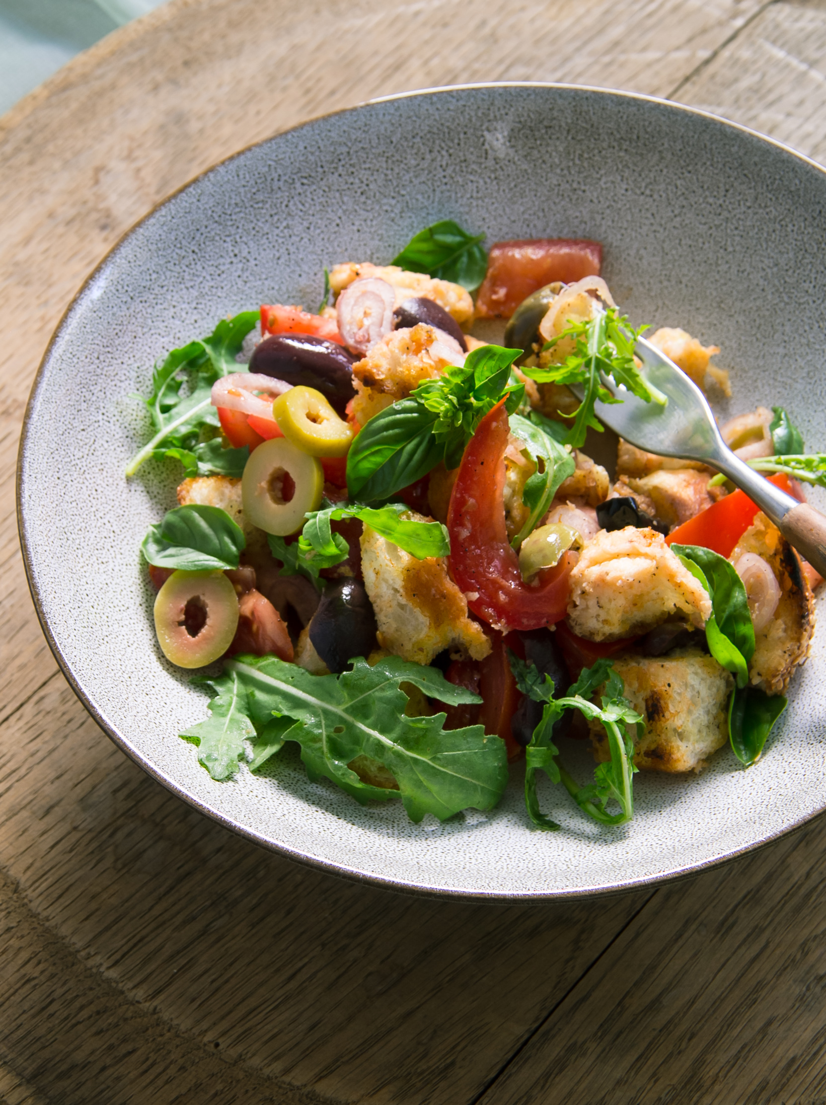 Also gab es heute italienischen Brotsalat aus den trockenen Brötchen (und trocken heißt hier steinhart!). Ich habe den Salat frei Schnauze und ohne Rezept gemacht – rein kam, was da war und gut passte. Ihr könnt ihn genauso variieren und nehmen, was euch schmeckt. Ich finde die würzigen Oliven geben herrliches Aroma und der Rucola und das Basilikum geben optisch und geschmacklich Frische.