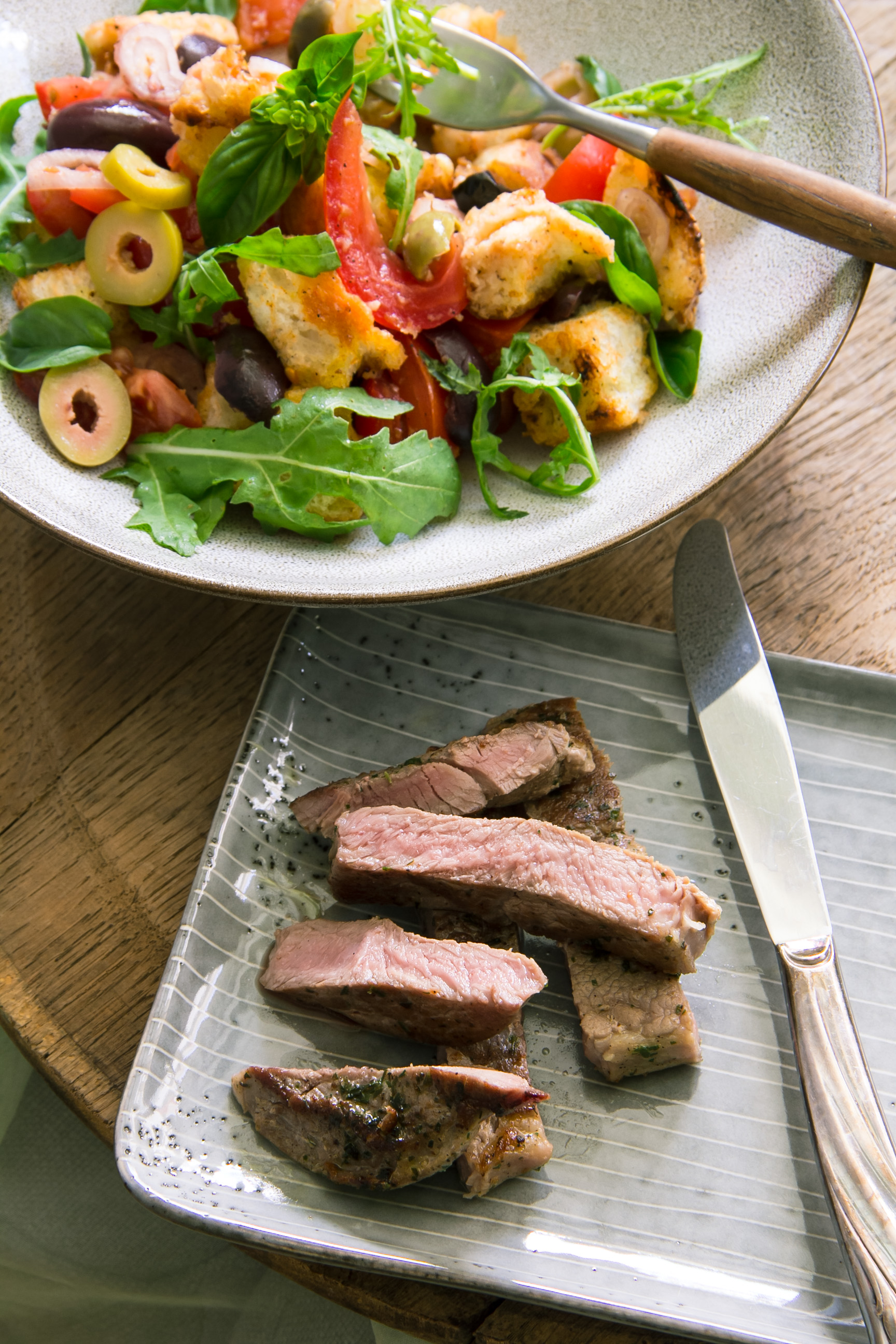Da kam mir dann auch die Idee, eine Panzanella zu machen. Da wird das altbackene Brot durch die Salatsoße und den Tomatensaft wieder weich und der Salat passt wunderbar zu Gegrilltem oder einem Lammkotelett aus der Pfanne.