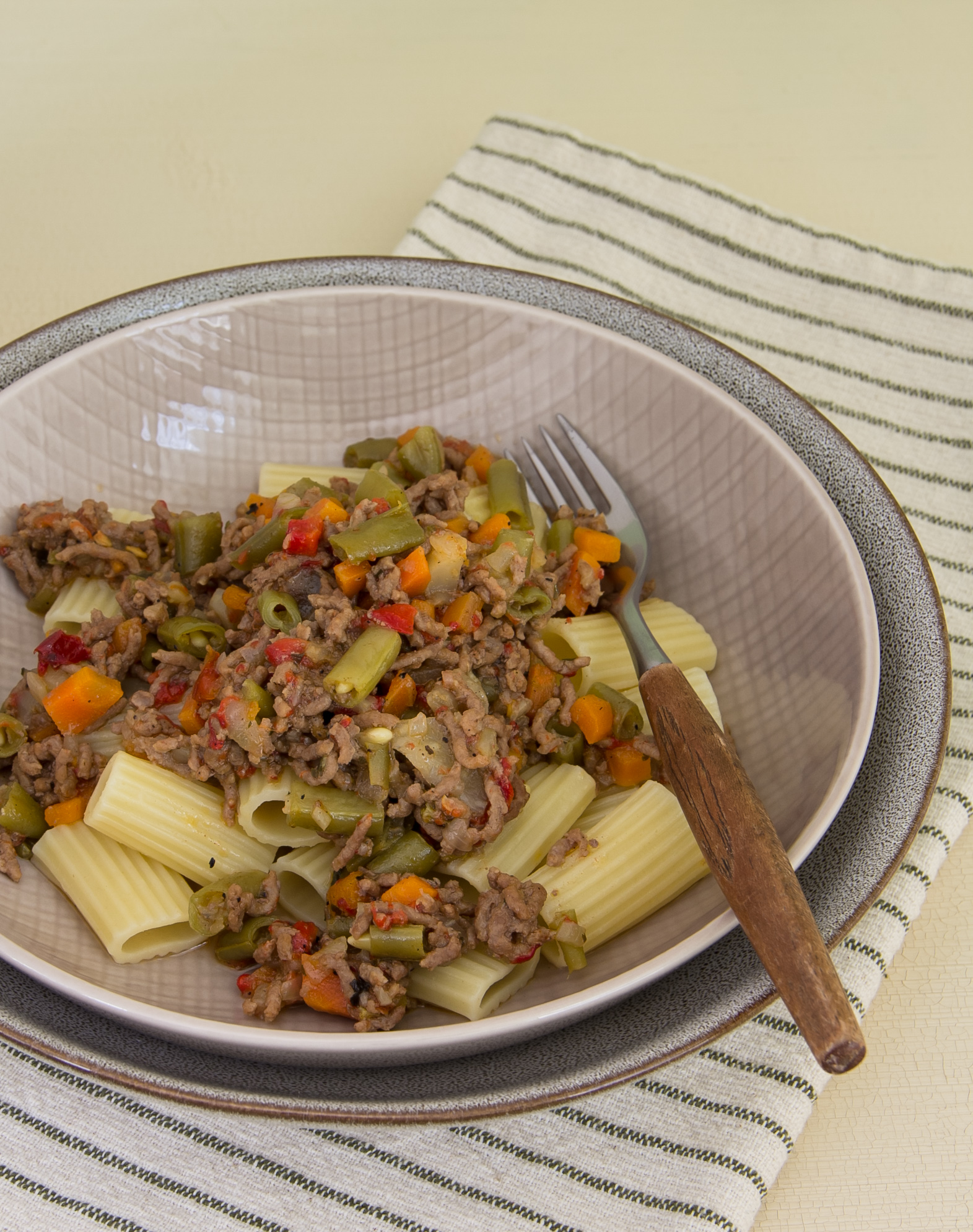 Diese PASTA COL RAGÙ E PEPERONI (Rezept 735) habe ich natürlich wieder ein kleines bisschen abgewandelt. Da ich Sellerie nicht ausstehen kann, habe ich stattdessen Fenchelknolle genommen. Die Erbsen habe ich beim Einkaufen vergessen, aber ich hatte noch blanchierte Buschbohnen da und habe die einfach klein geschnitten. Und die eingelegte Paprika war leider weniger, als ich dachte – Naschkater hatte wohl noch mal unbemerkt ins Glas gegriffen. Mit etwas mehr fruchtiger Schote wird es sicher noch leckerer.