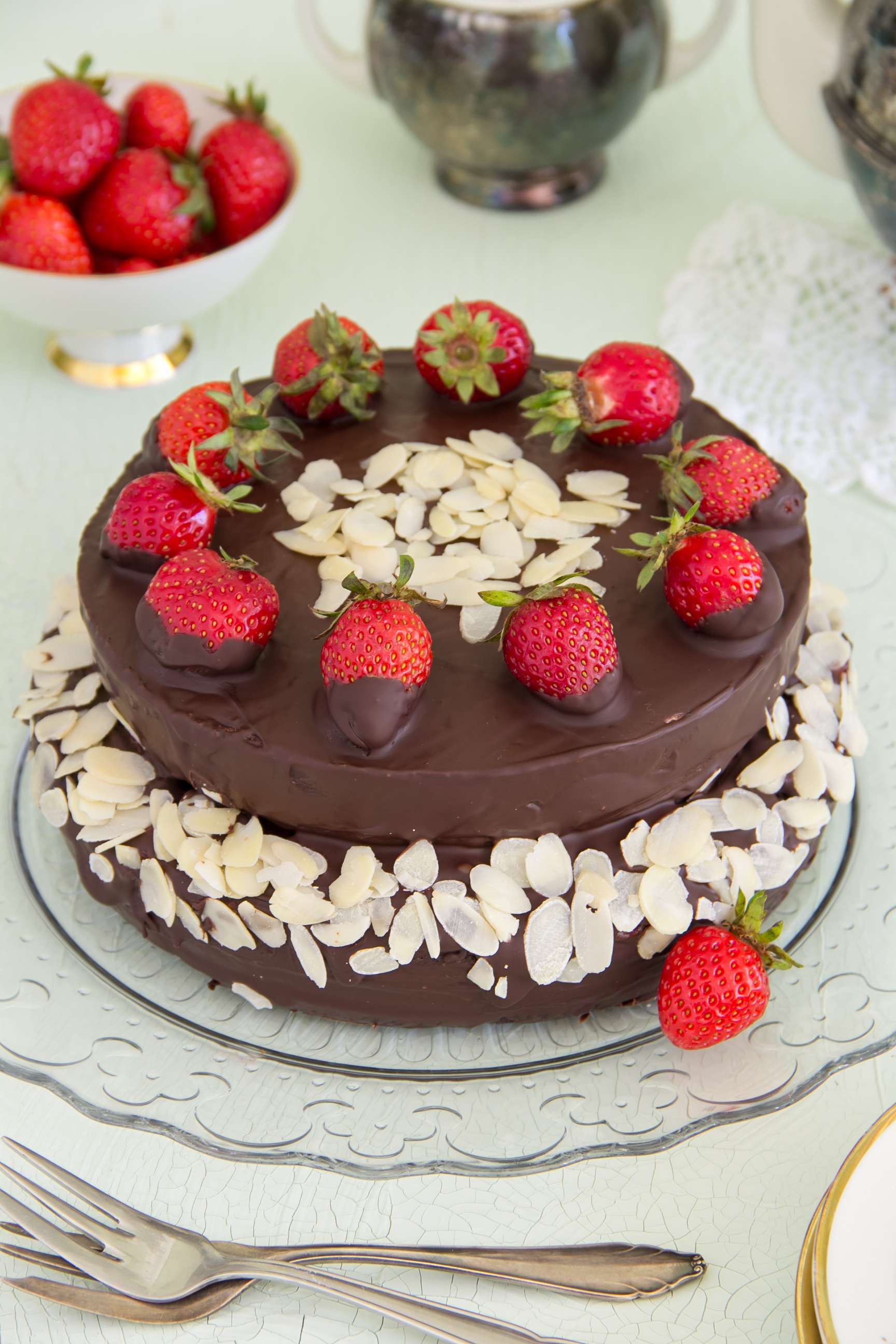Die Böden 10 Minuten in den Formen abkühlen lassen, dann herausnehmen und auf einem Gitter vollständig abkühlen lassen. Einen Boden auf eine Platte legen, mit der Erdbeerkonfitüre bestreichen und dicht mit den Erdbeerscheiben belegen. Dann etwas zerlassene Kuvertüre darüber träufeln und den zweiten Boden aufsetzen. Die Torte seitlich und oben mit Kuvertüre bestreichen, dann die Erdbeeren in die Schokolade tauchen und kreisförmig außen auf die Torte setzen.