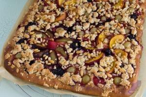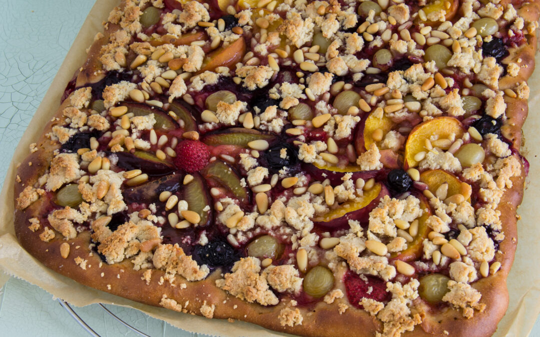 Mediterraner Hefekuchen mit saisonalem Obst, Mandelstreuseln & Pinienkernen (1)
