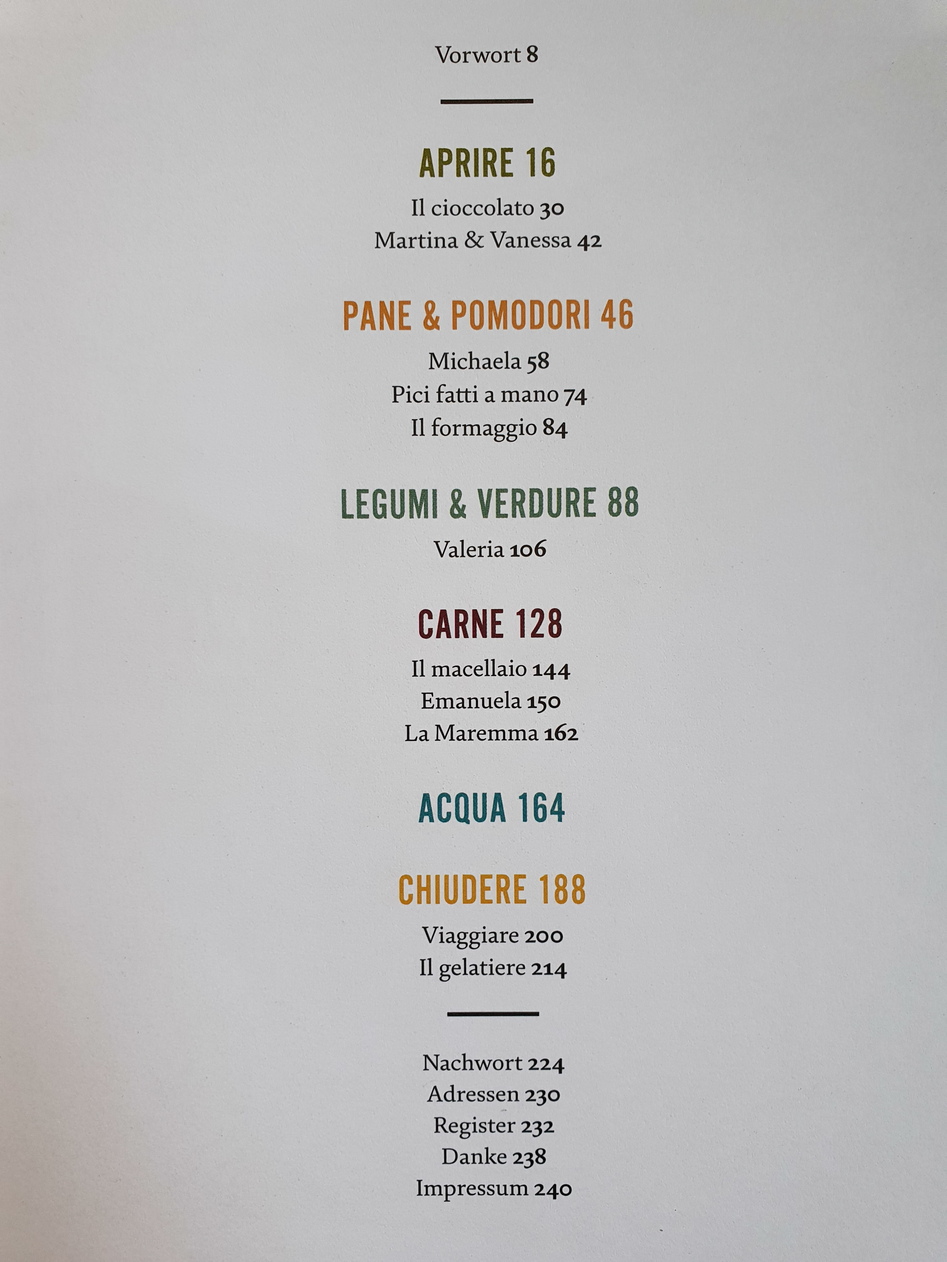 Kapitel 1 dreht sich um den Aperitif, Kapitel 2 um „Brot und Tomaten“. In Kapitel 3 findet man Rezepte aus Hülsenfrüchten und Gemüse, dann folgen Fleisch und Fisch, bevor das Buch mit den Desserts und Kuchen „schließt“ (chiudere= schließen).