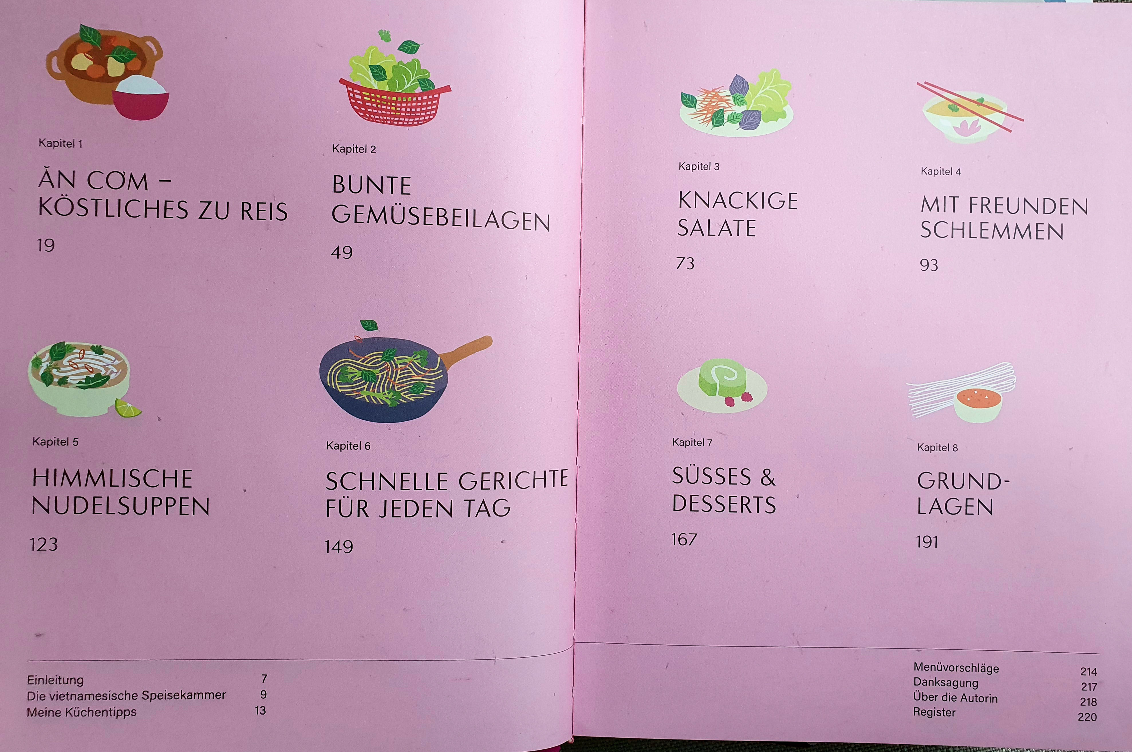 Die 8 Kapitel mit Rezepten werden begleitet von Einleitung, einem Kapitel „Die vietnamesische Speisekammer“, „Meine Küchentipps“ und schließlich von „Menüvorschlägen“ und den gängigen Schlussteilen.