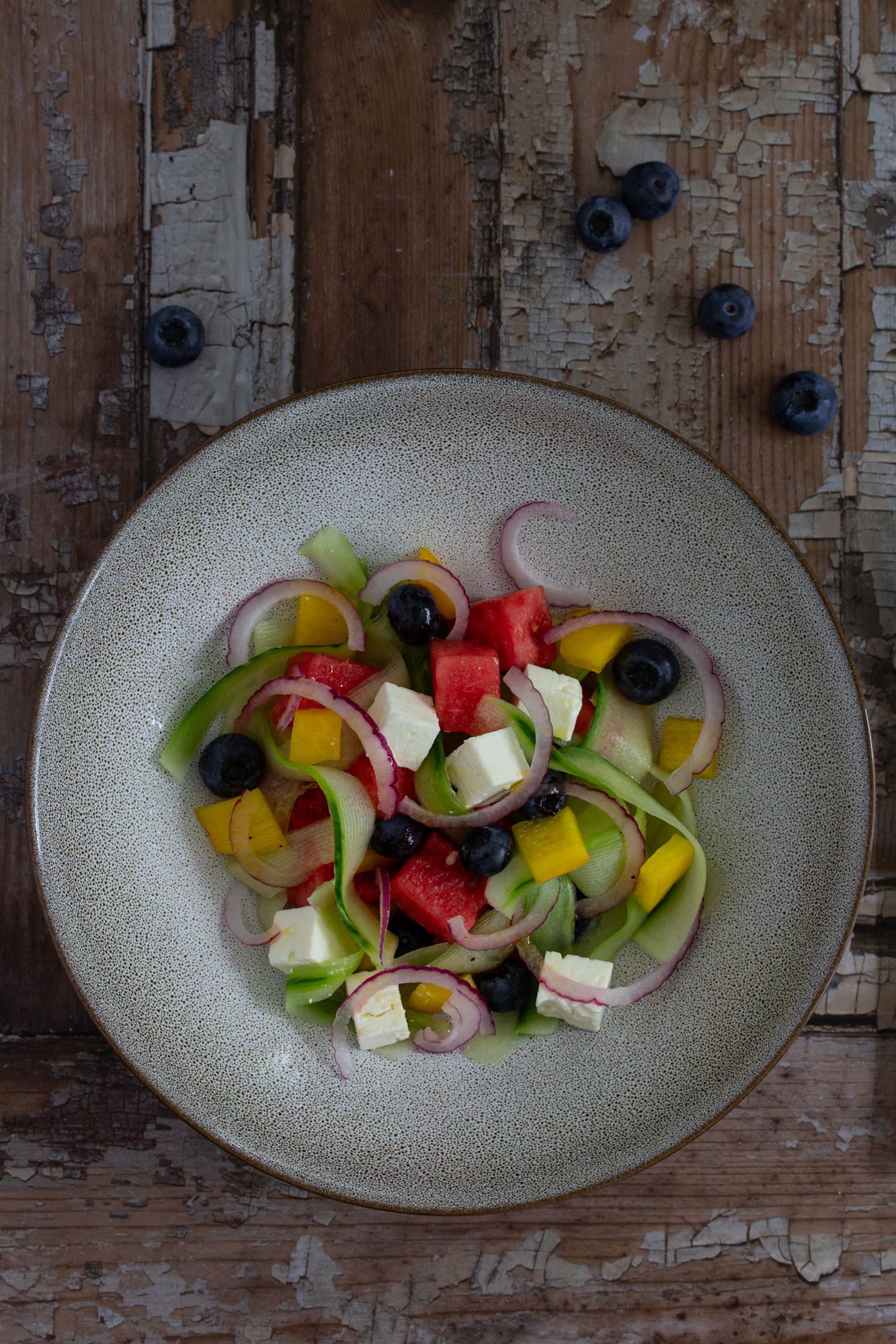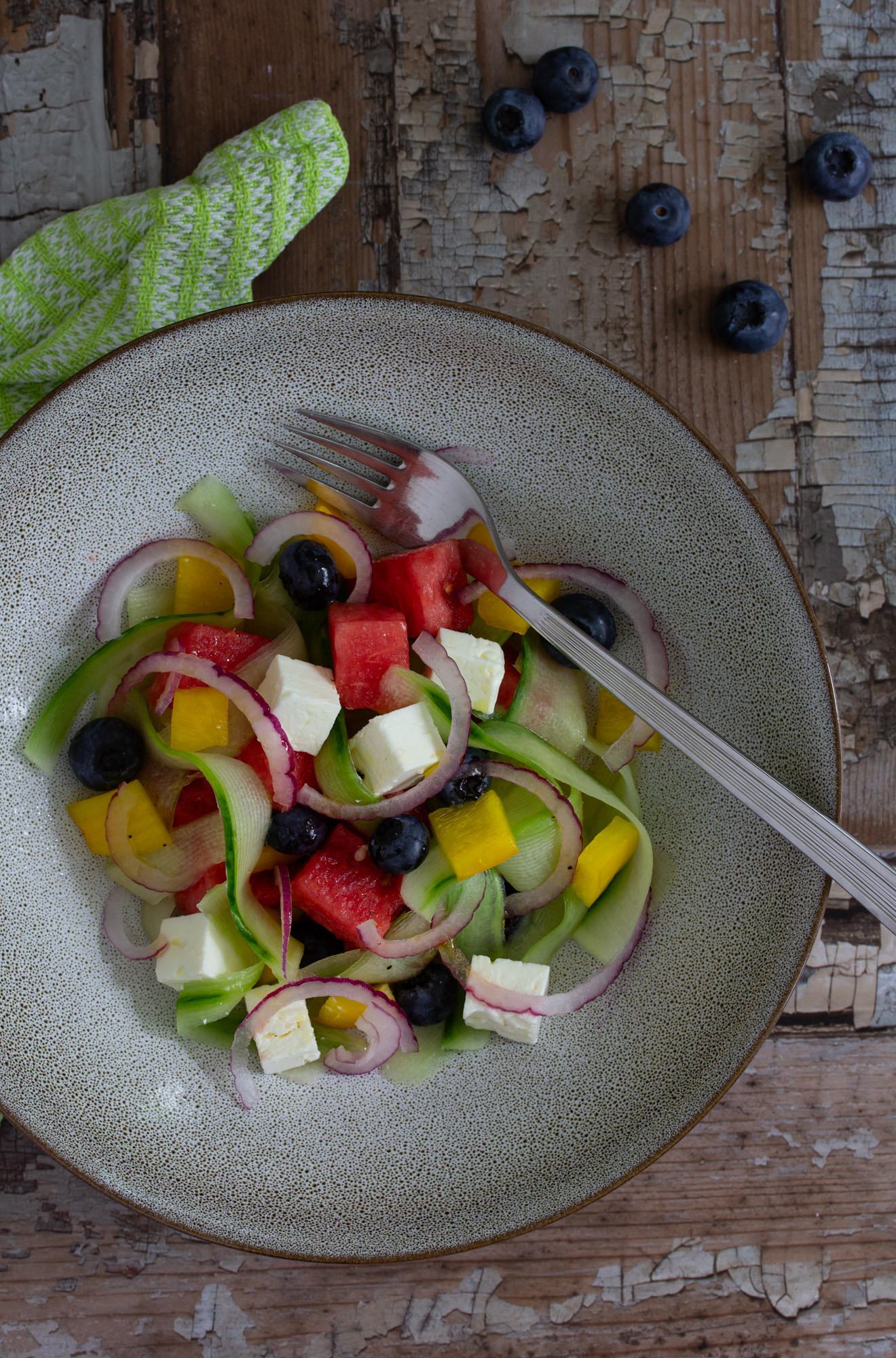 Bunter Sommersalat mit Gurke, Paprika, Wassermelone, Feta & Heidelbeeren