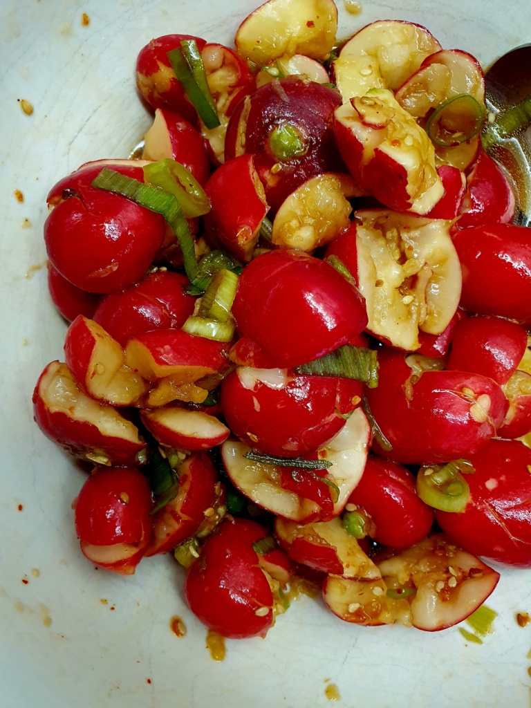 Der Kühlschrank war eh leer, also ging es am Samstag direkt zur Farm, um Frischfutter zu kaufen. Da lagen herrliche Radieschen und schrien geradezu nach so einem Salat. Er ist super einfach gemacht und sooo lecker! Scharf, umami, süßlich, knackig – alles dabei. Und beim Smashen mit dem Nudelholz oder Fleischklopfer könnt ihr Alltagsfrust abbauen. Nur nicht zu arg zuschlagen, sonst sind sie Matsch.
