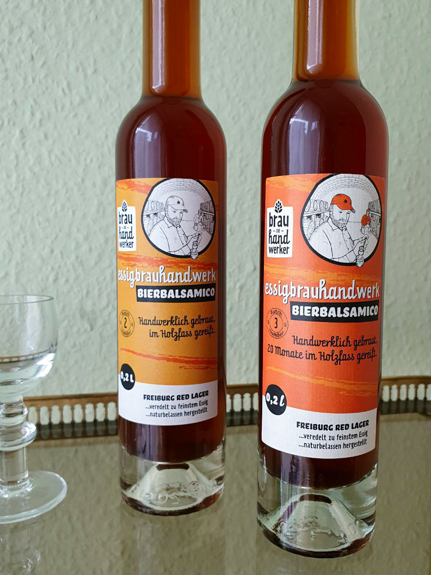 In Freiburg gibt es aber einen besonderen Essig, den ich neulich ausprobieren durfte: Bier-Balsamico! Die Brauhandwerker* machen aus überschüssigem Bier Essig, und zwar mit geschmacklichem Erfolg. Der Essig ist richtig lecker und passt, wie Essig aus Wein auch, prinzipiell zu allem. Mit einem Hauch Wasser verdünnt (oder für Säure-Fans auch pur) könnte man ihn sogar als Aperitiv-Essig reichen. Ich habe beide Sorten pur probiert, um den Geschmack zu testen, und fand sie recht „trinkbar“. :)