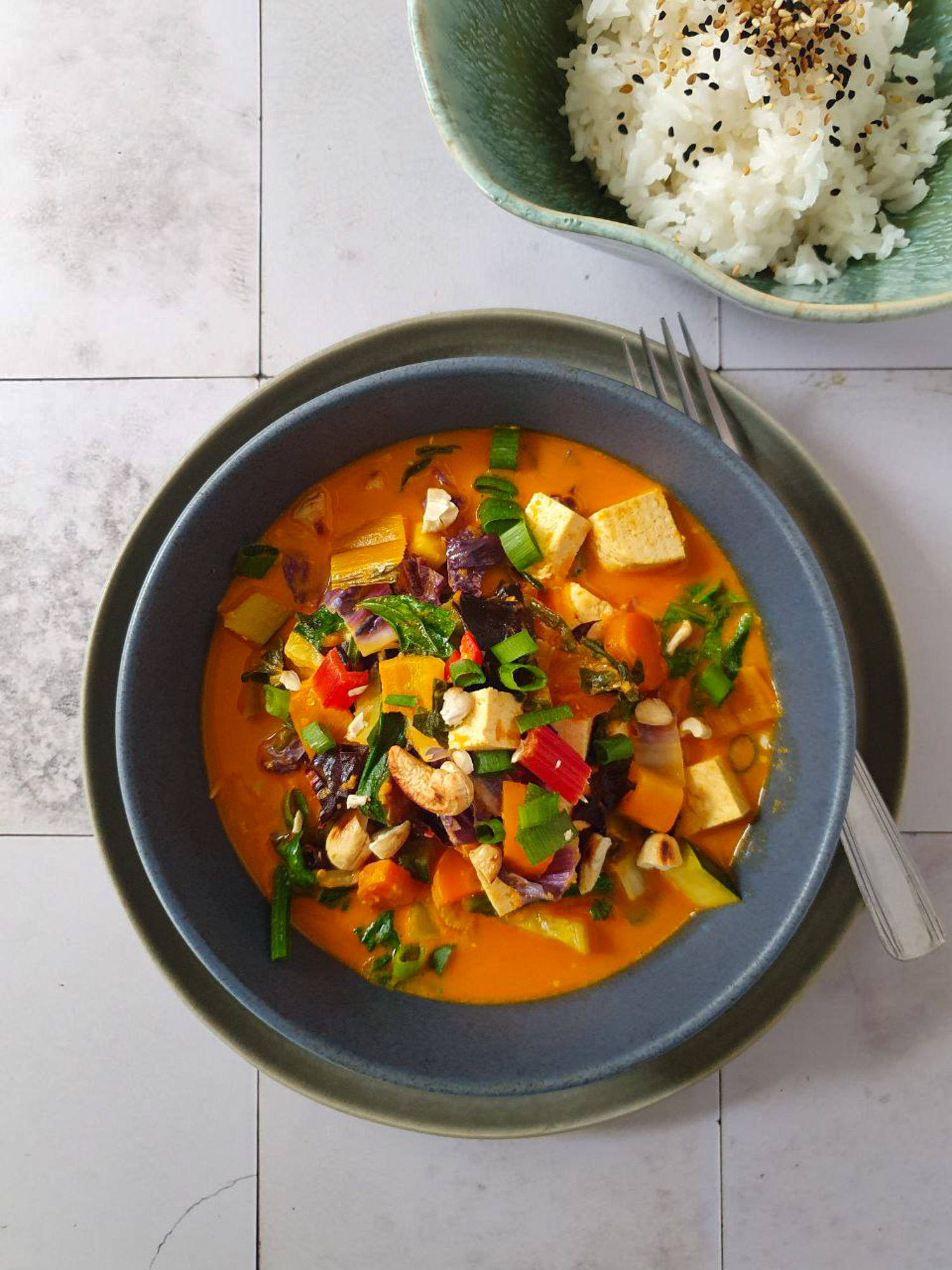 Abschmecken und mit Sesam-Reis, Frühlingszwiebeln und Cashews servieren. Nach Geschmack etwas Limettensaft darüberträufeln.