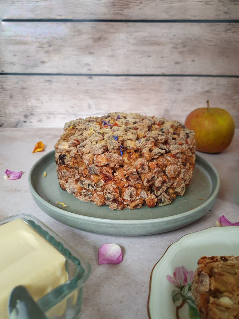 Es gewinnt keinen Schönheitspreis, deshalb habe ich statt weißem Puderzucker einen Hauch Dattelzucker drüber gepudert und getrocknete Blüten drüber gestreut. Zum Schneiden braucht man ein scharfes Zackenmesser. Aber dann steht der genussvollen Nascherei nichts im Weg.