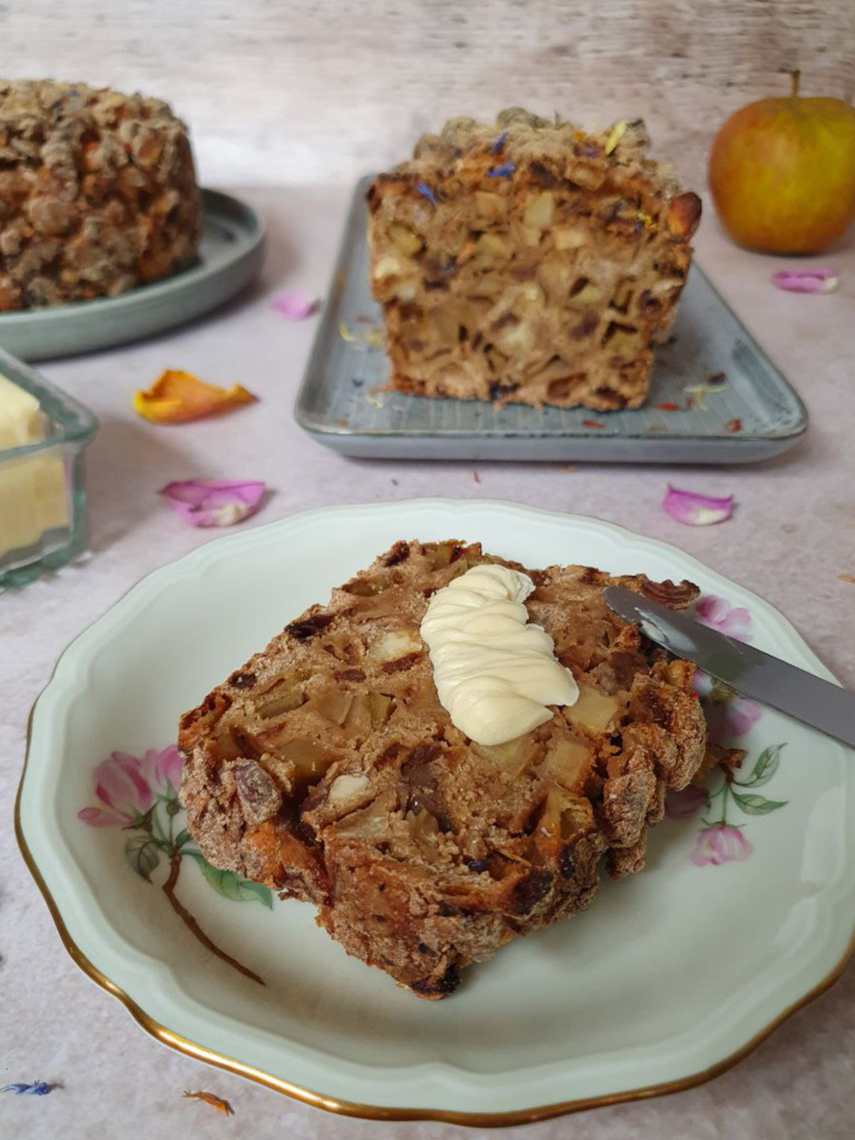 Ich hoffe, euch schmeckt das Apfelbrot auch so gut wie uns und ihr genießt es mit lieben Menschen bei einem gemeinschaftlichen Kaffeekränzchen.