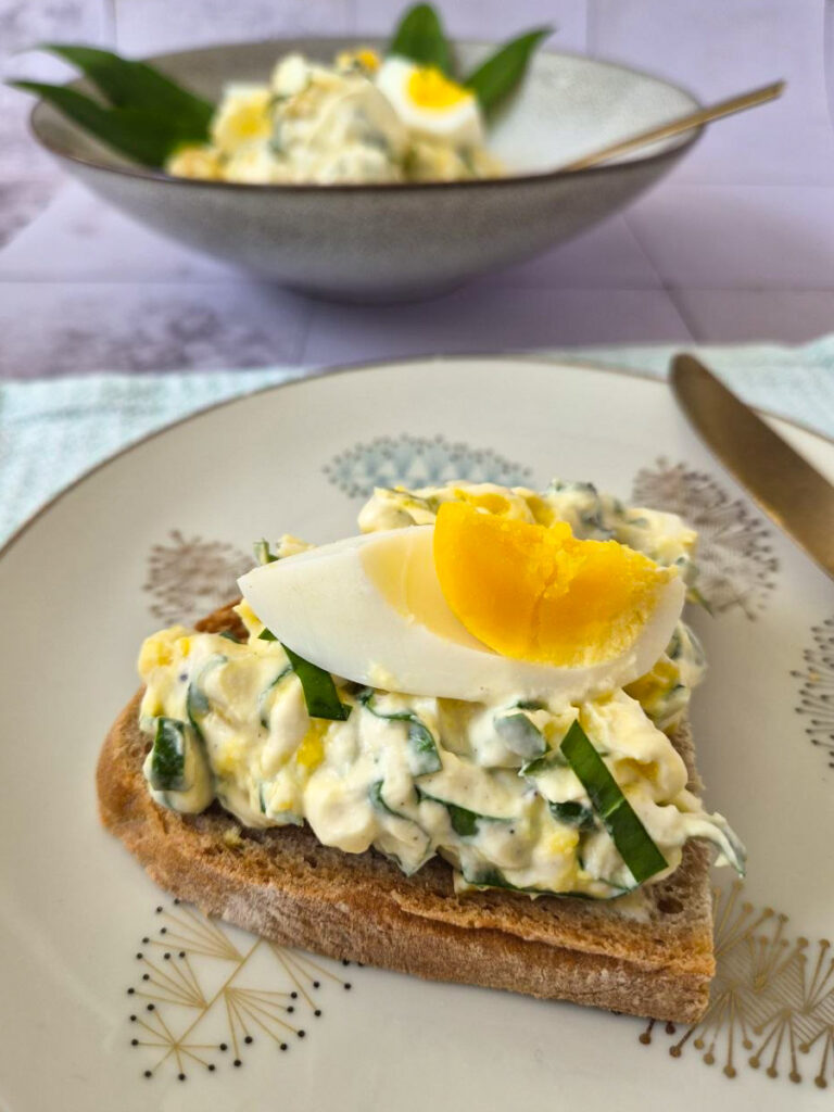 Meine Eltern haben ganz viel Bärlauch im Garten und ich habe fleißig geernet vor der Rückreise. Neben Pesto habe ich auch welchen in den Eiersalat gegeben. Ihr könnt natürlich auch Schnittlauch nehmen, oder auch frischen Dill, oder mischen – ganz wie ihr mögt.