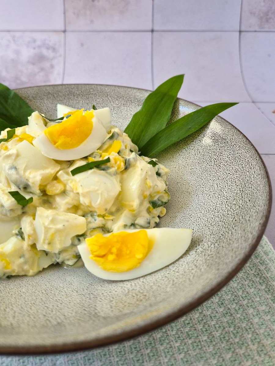 Meine Eltern haben ganz viel Bärlauch im Garten und ich habe fleißig geernet vor der Rückreise. Neben Pesto habe ich auch welchen in den Eiersalat gegeben. Ihr könnt natürlich auch Schnittlauch nehmen, oder auch frischen Dill, oder mischen – ganz wie ihr mögt.
