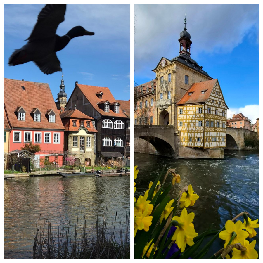 Von dort aus sind wir dann am Wasser entlang in die Stadt gelaufen, vorbei am „Klein Venedig“ Bambergs. Dort flog mir dekorativ eine Ente ins Bild – ein seltener Schnappschuss, würde ich sagen. Die Stadt wurde im Krieg nicht bombardiert und ist super erhalten. Viele alte Fassaden zieren die Straßen. Speziell und berühmt ist natürlich das Alte Rathaus. Beim ersten Besuch war Aprilwetter, aber manchmal kam die Sonne durch die dunklen Wolken. Kurz danach graupelte es, aber das Licht war klasse für Fotos!