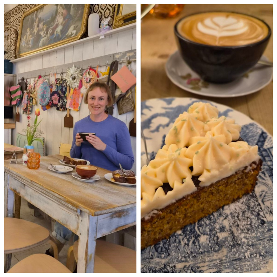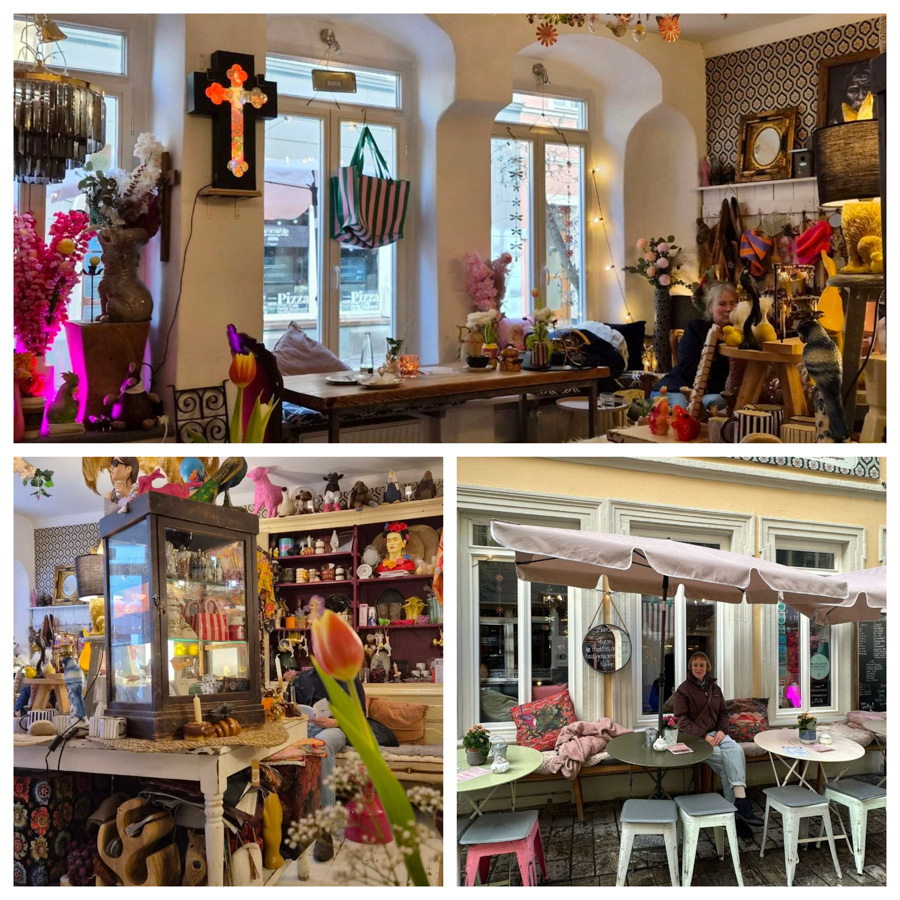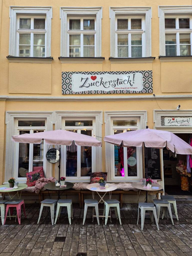 Einige Meter weiter gibt es das Café „Zuckerstück“. Innen ist es sehr bunt und voll, definitiv wird einem nicht langweilig, denn es gibt viel zu betrachten. Der Kaffee ist lecker und es gibt sogar portugiesische Kaffeespezialitäten wie Galao. Die Auswahl hausgemachter Kuchen ist riesig und alles sieht so toll aus! Auch belegte Brote und Quiche ist im Angebot.