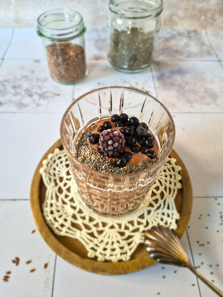 Der Pudding schmeckt nur leicht süß, wer es süßer mag, erhöht den Dattelanteil. Aber ich mag das so, denn ich frühstücke schon lange nicht mehr süß wie früher und genieße das Schokoladige sehr. Nach Belieben mache ich ein bisschen Kaffeegewürz dazu oder Zimt oder auch gemahlenen Ingwer. Da könnt ihr nehmen, was ihr mögt. Auch einen Schuss Kaffee könnte ich mir gut vorstellen.
