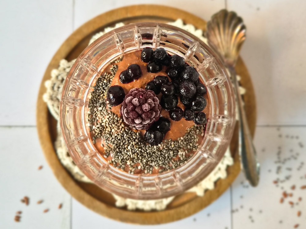 Ich bereite das Ganze immer abends vor, stelle es nachts in den Kühlschrank und muss morgens nur noch kurz pürieren, dann kann ich losschlemmen. Dabei fühle ich mich ein bisschen wie Bridget Jones: Schokolade zum Frühstück – nur eben in gesund.