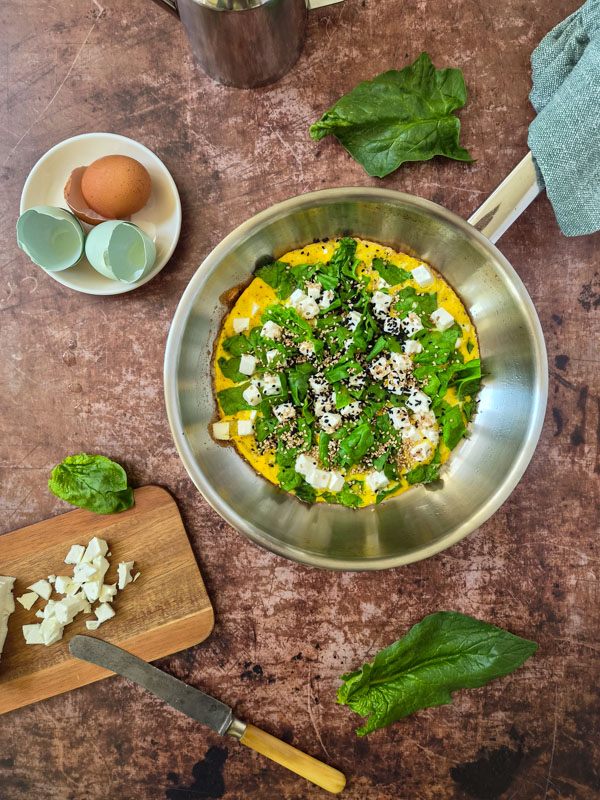 Das Ei hineingeben, Feta und Spinat darauf verteilen und einen passenden Deckel auflegen. Das Omelette ca. 5 Minuten braten und stocken lassen, dann den Deckel abnehmen, ohne dass Kondenswasser in die Pfanne läuft. Mit Schwarzkümmel und Sesam bestreuen.
