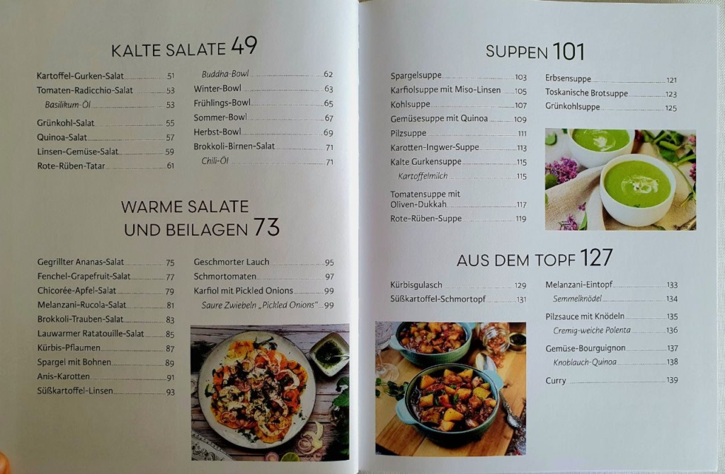 Die weiteren Kapitel lauten: Aufstriche, Frühstück, Kalte Salate, Warme Salate und Beilagen, Suppen, Aus dem Topf, Aus der Pfanne, Aus dem Ofen, Kuchen und Desserts, Brot und Gebäck.