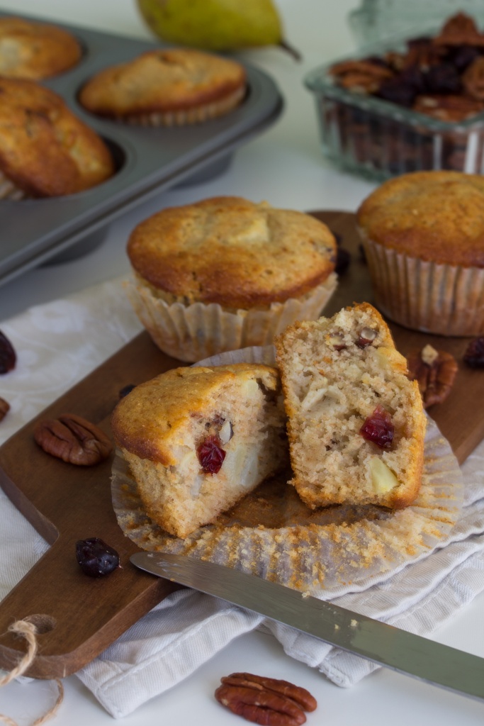 Da sind Muffins ja immer wunderbar geeignet. Also entschied ich mich für Muffins mit Birnen, denn die sind noch regional erhältlich und schmecken wunderbar in Kuchen, und gab noch gehackte Pekannüsse und Cranberries dazu – eine köstliche Mischung!